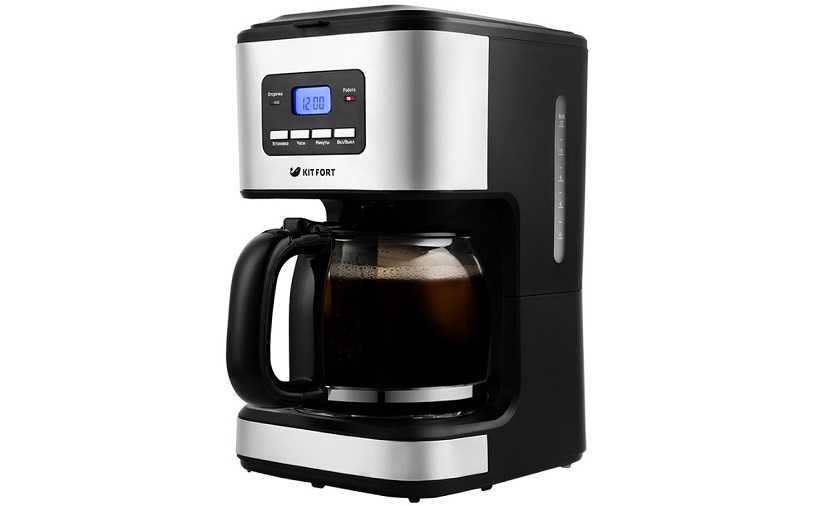 Капельная кофеварка Kitfort стоимостью 2500 руб. укомплектована сегментным дисплеем, позволяющим запрограммировать отложенный запуск – можно поставить таймер на 5 минут раньше будильника и проснуться от расползающегося по квартире запаха кофе. Принцип работы KT-719 классический – вода из резервуара (1400 мл) в виде «горячего душа» поступает в контейнер с молотым кофе в многоразовом сетчатом фильтре, откуда уже готовый напиток капает в чайник (вмещает 12 чашек). Поддон для чайника оборудован системой подогрева, поддерживающей температуру напитку в течение 40 минут после приготовления. Ещё один приятный бонус – противокапельная система: готовый напиток подаётся только если есть кофейника.