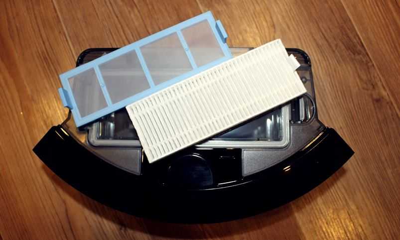 Пылесборник получил несколько фильтров: HEPA, поролоновый, предварительной очистки. Рядом с ним находится вентиляционное отверстие. В передней части боковой панели расположен механический бампер.