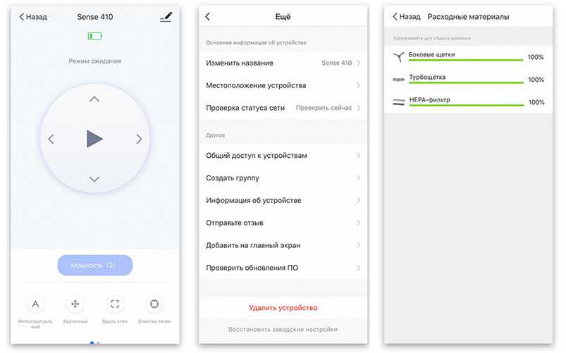 Подключение осуществляется к сети с частотой 2,4 МГц. После подключения обеспечивается доступ к большему количеству функций: график уборки с периодичностью раз в неделю, изменение уровня подачи воды при влажной уборке, управление несколькими пылесосами через одно приложение, назначение собственного имени роботам, проверка наличия обновлений. Также здесь видно зарядку аккумулятора, степень износа фильтров.