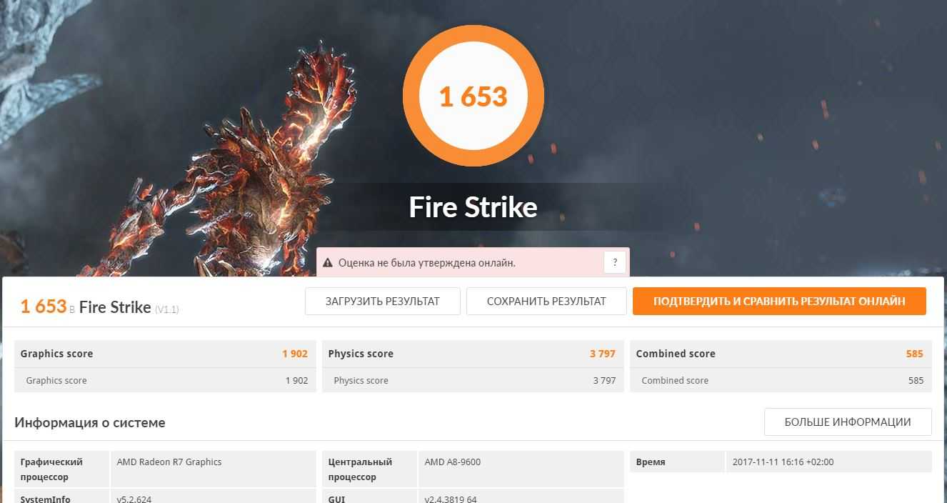Тестирование в 3DMark показало 1681 балла за Fire Strike, включая 1942 очка за графику, 4182 за физику и 592 за матема… то есть, за комбинированный тест. Накинув 300 очков, получим результат моего старого компьютера с Core i3-4130 и GTX 650 2GB, но даже сейчас такой набор стоит на $50 дороже.