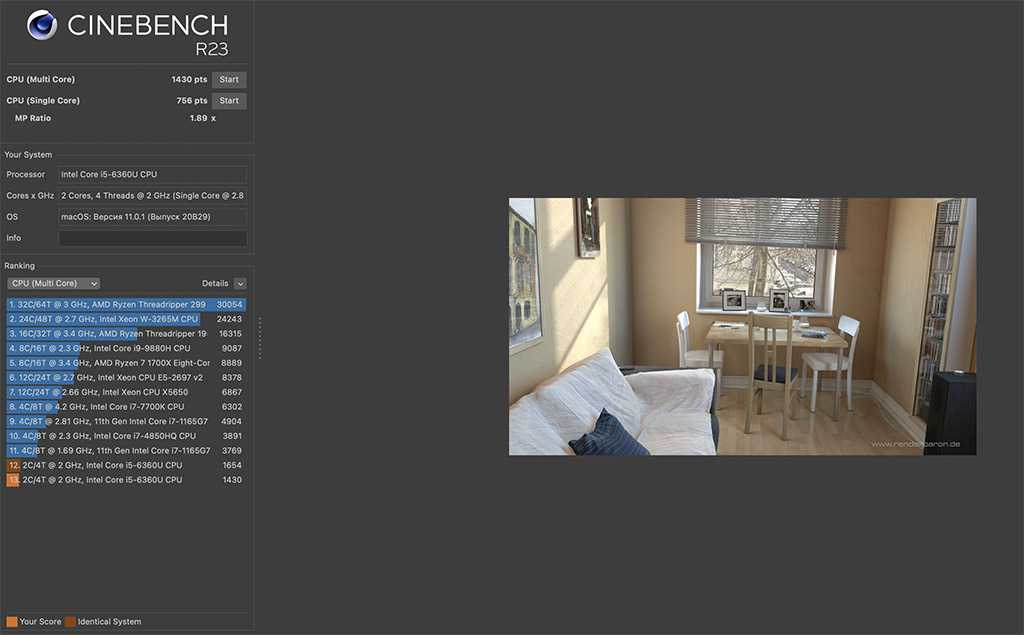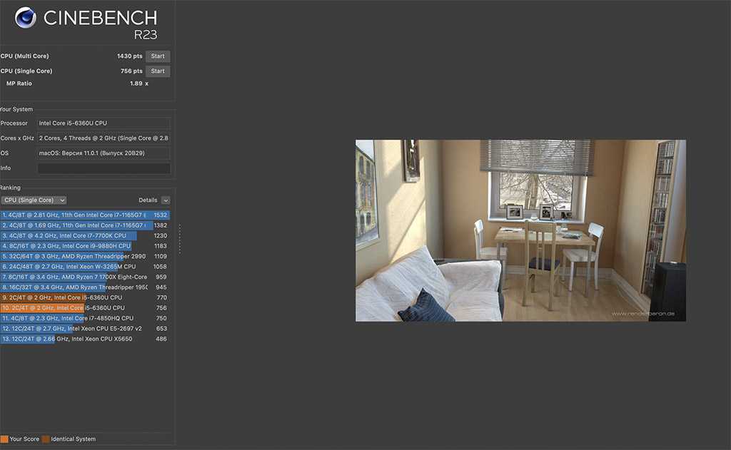 ► 13-дюймовый MacBook Pro на Intel: 1430 – многоядерный, 756 – одноядерный
