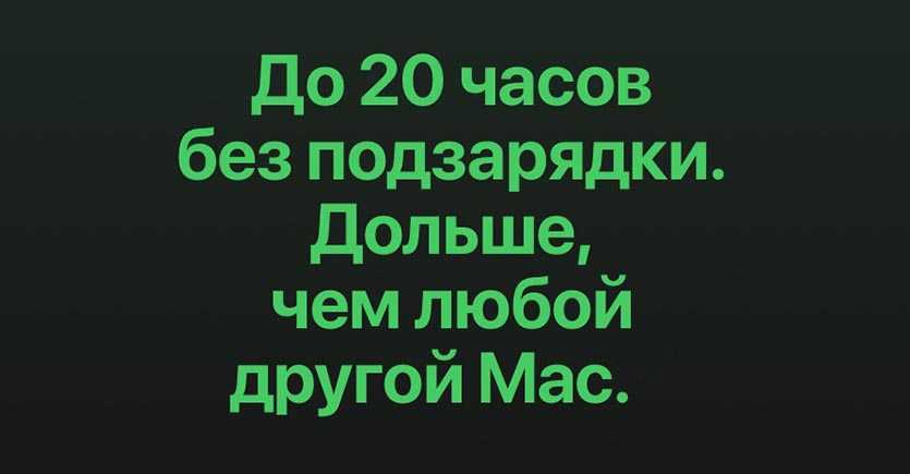 И хотя емкость батареи осталась прежней, время автономной работы заметно выросло. Все благодаря энергоэффективности SoC M1, которая дает возможность работать дольше. По данным Apple батареи хватит на 17 часов беспроводного доступа в Интернет или до 20 часов воспроизведения фильмов. Можно говорить о фактическом удвоении времени автономной работы!