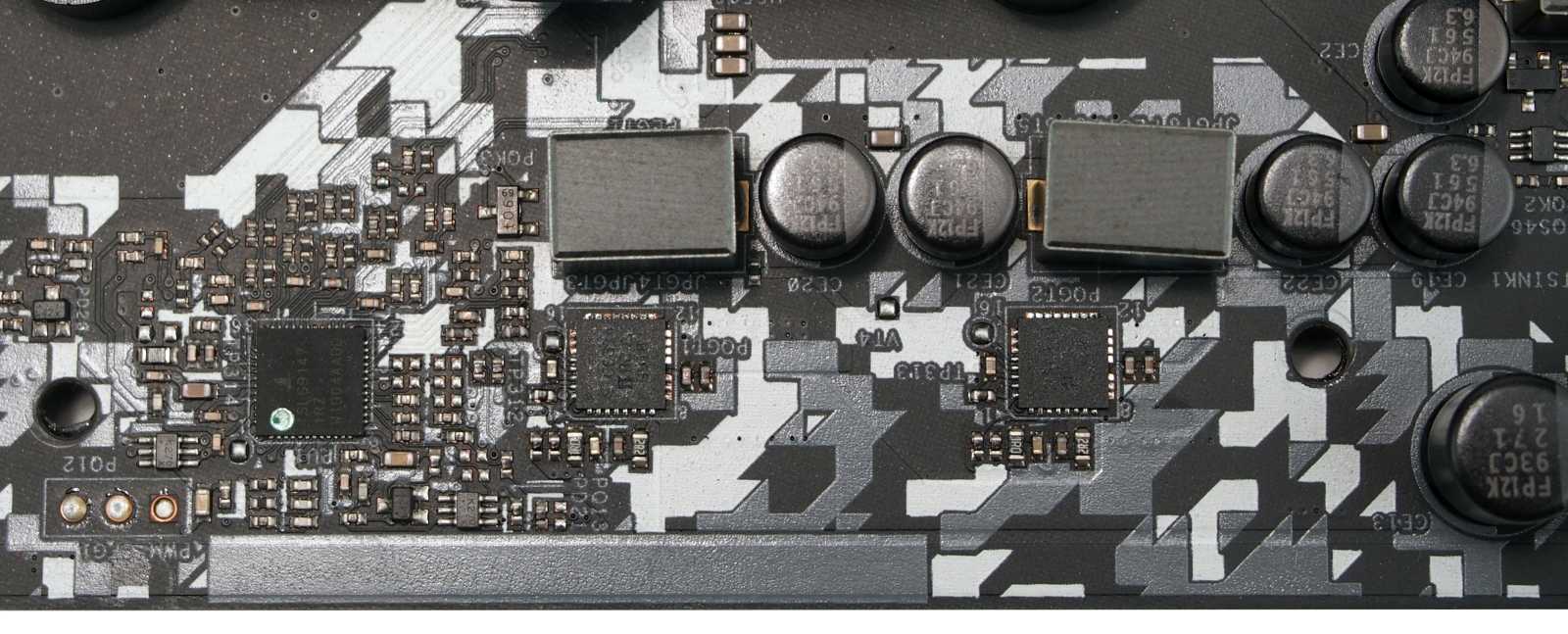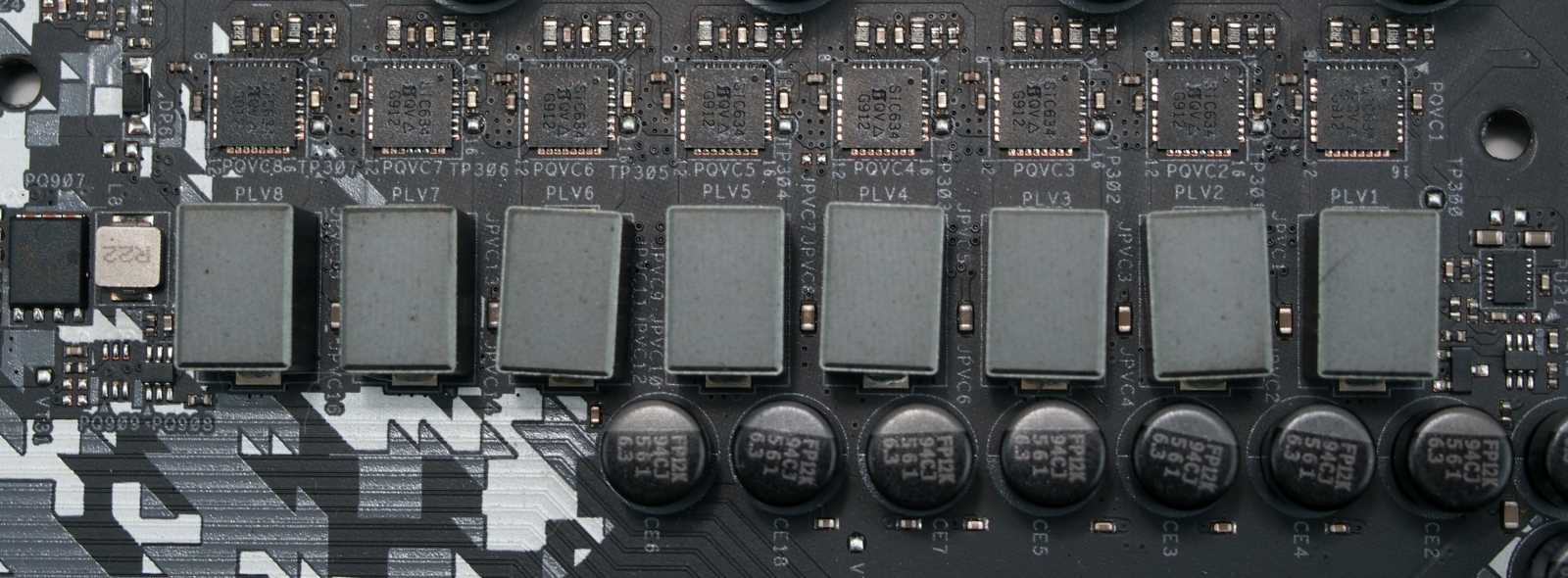 Питание процессора 10-фазное, конденсаторы 60А, мосфеты Vishay, восемь штук SiC634 и пара SiC632.