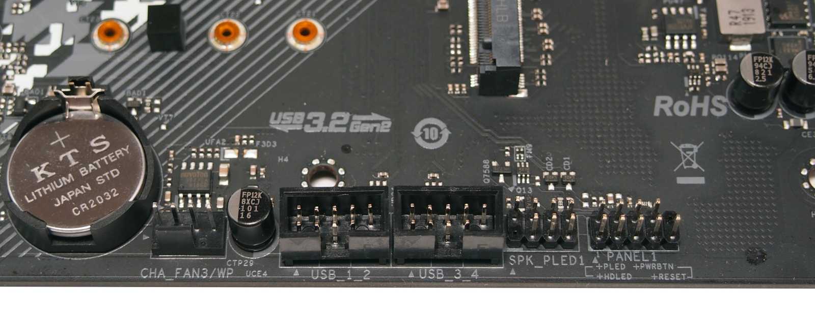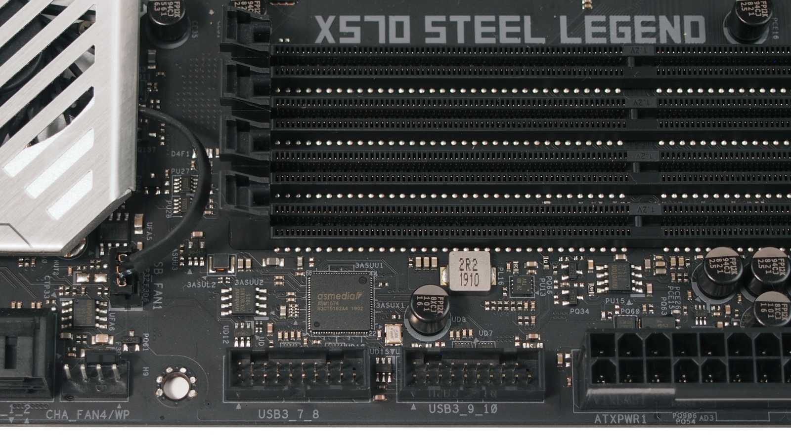 Пара колодок 19-пин в верхнем правом углу X570 Steel Legend служат для вывода разъемов USB 3.2 Gen1 на фронтальную панель корпуса ПК.