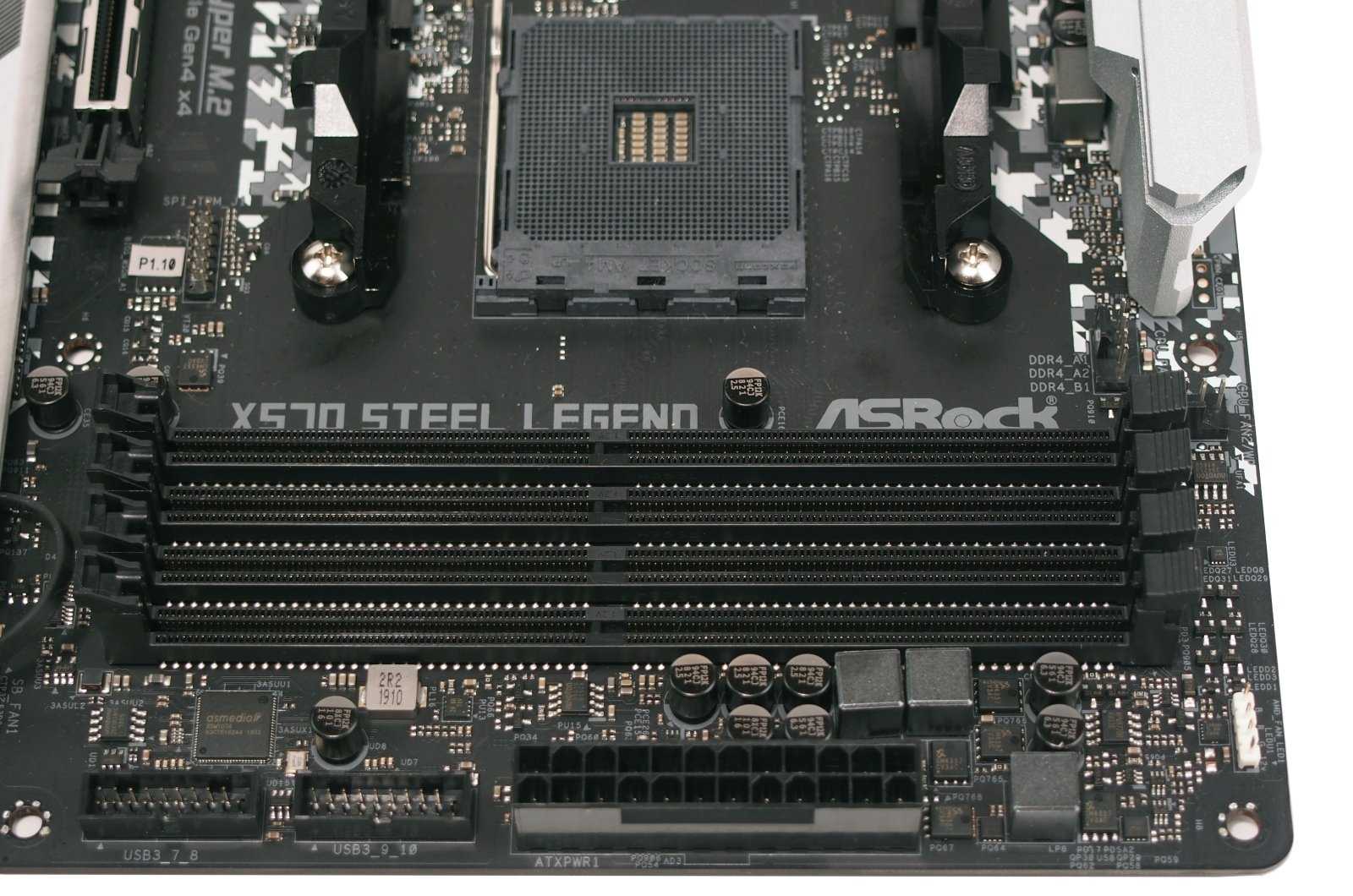Питание же для самой материнской платы поступает по стандартному 24-пин разъему, расположенному в правом верхнем углу PCB. Для установки оперативной памяти X570 Steel Legend оборудована четырьмя разъемами DIMM DDR4 с поддержкой памяти от 2133 до 4666 МГц. Общий установленный объем ОЗУ может составлять внушительные 128 Гб.