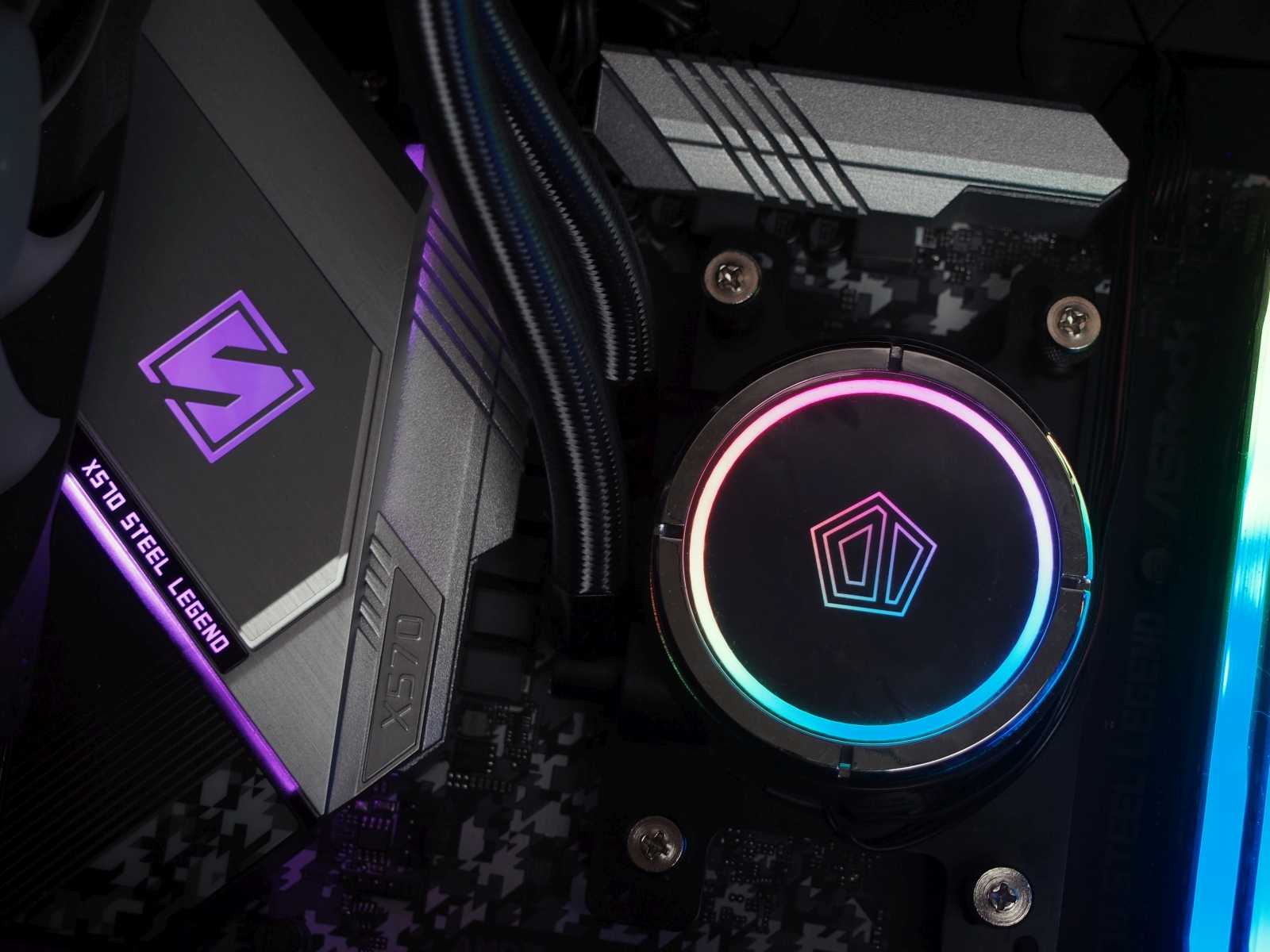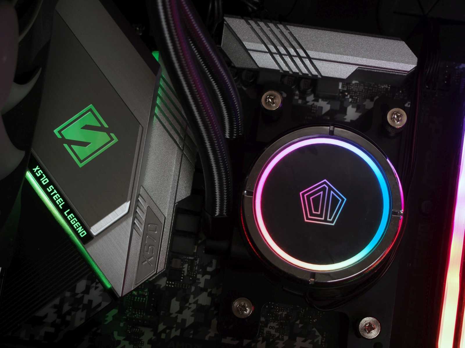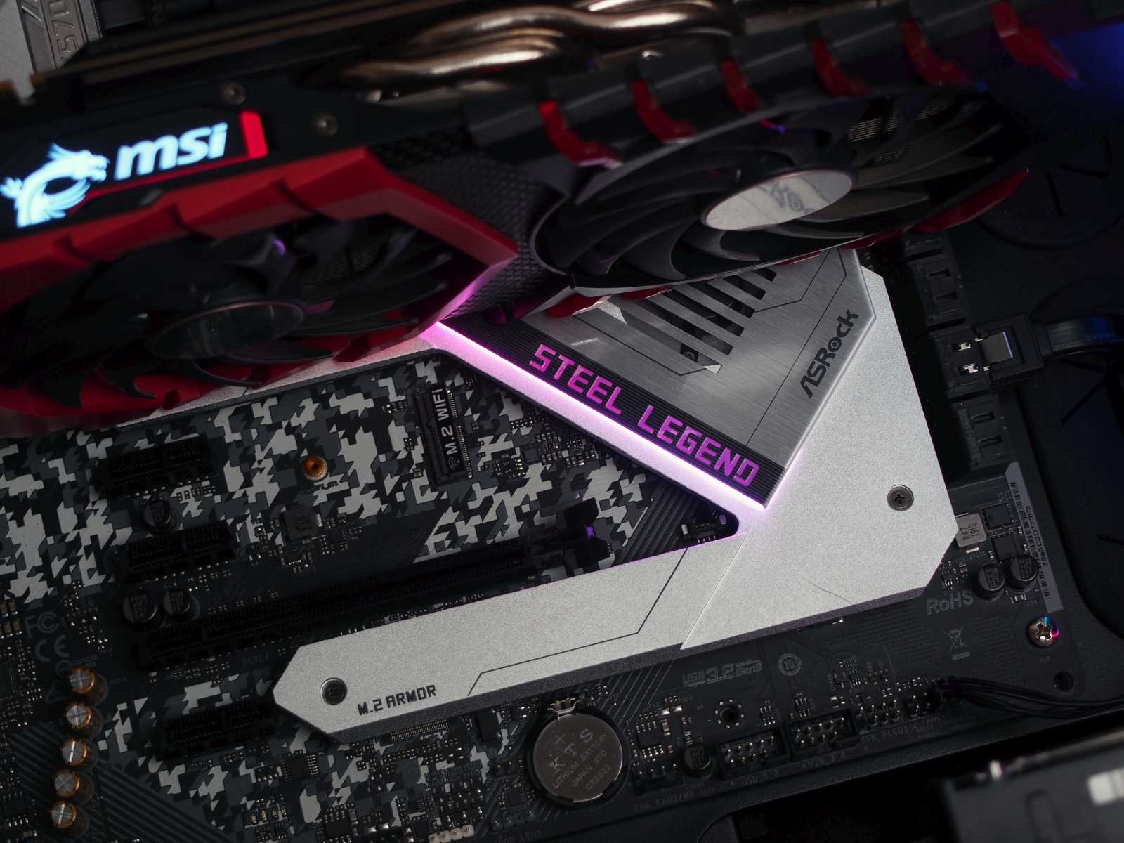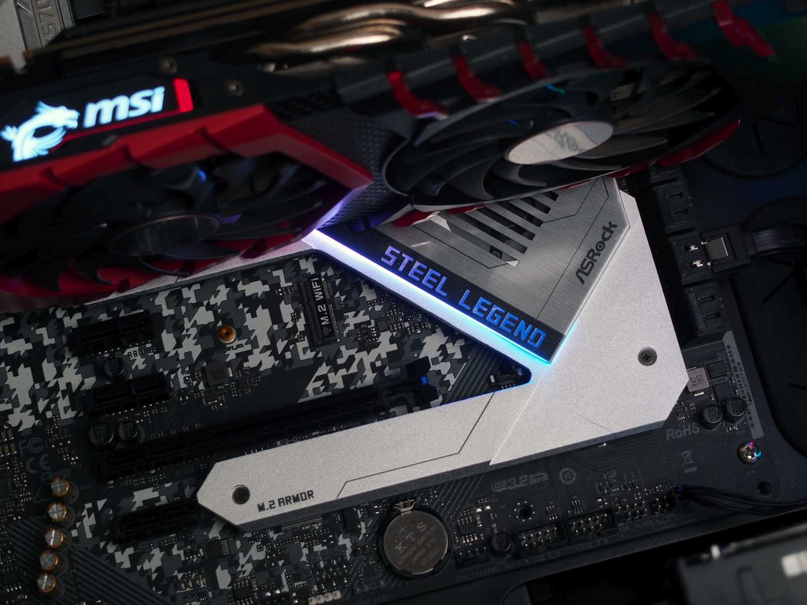 Не последнее значение в конструкции X570 Steel Legend имеет RGB-подсветка материнской платы. Она реализована на корпусе радиатора накопителей и на декоративной панели возле радиатора VRM. Смотрится подсветка очень выразительно и ярко.