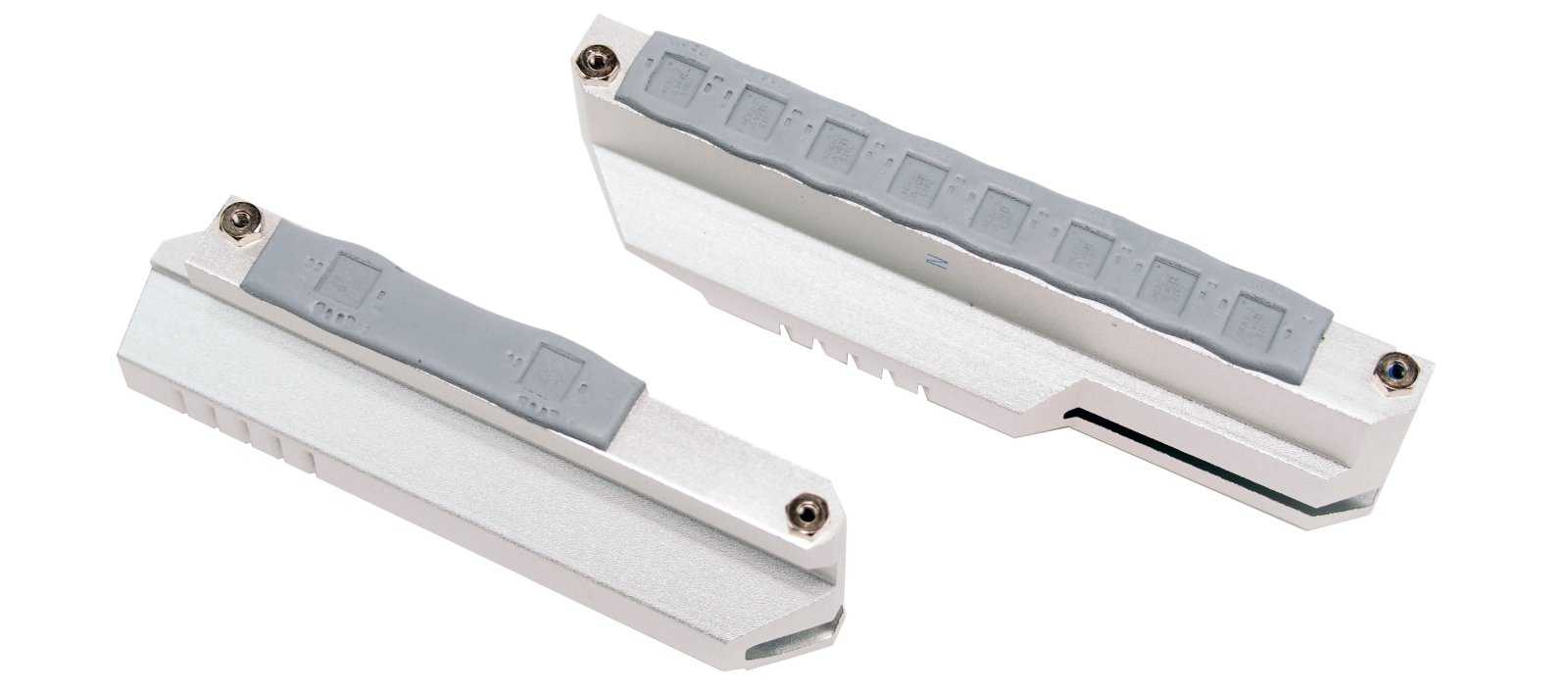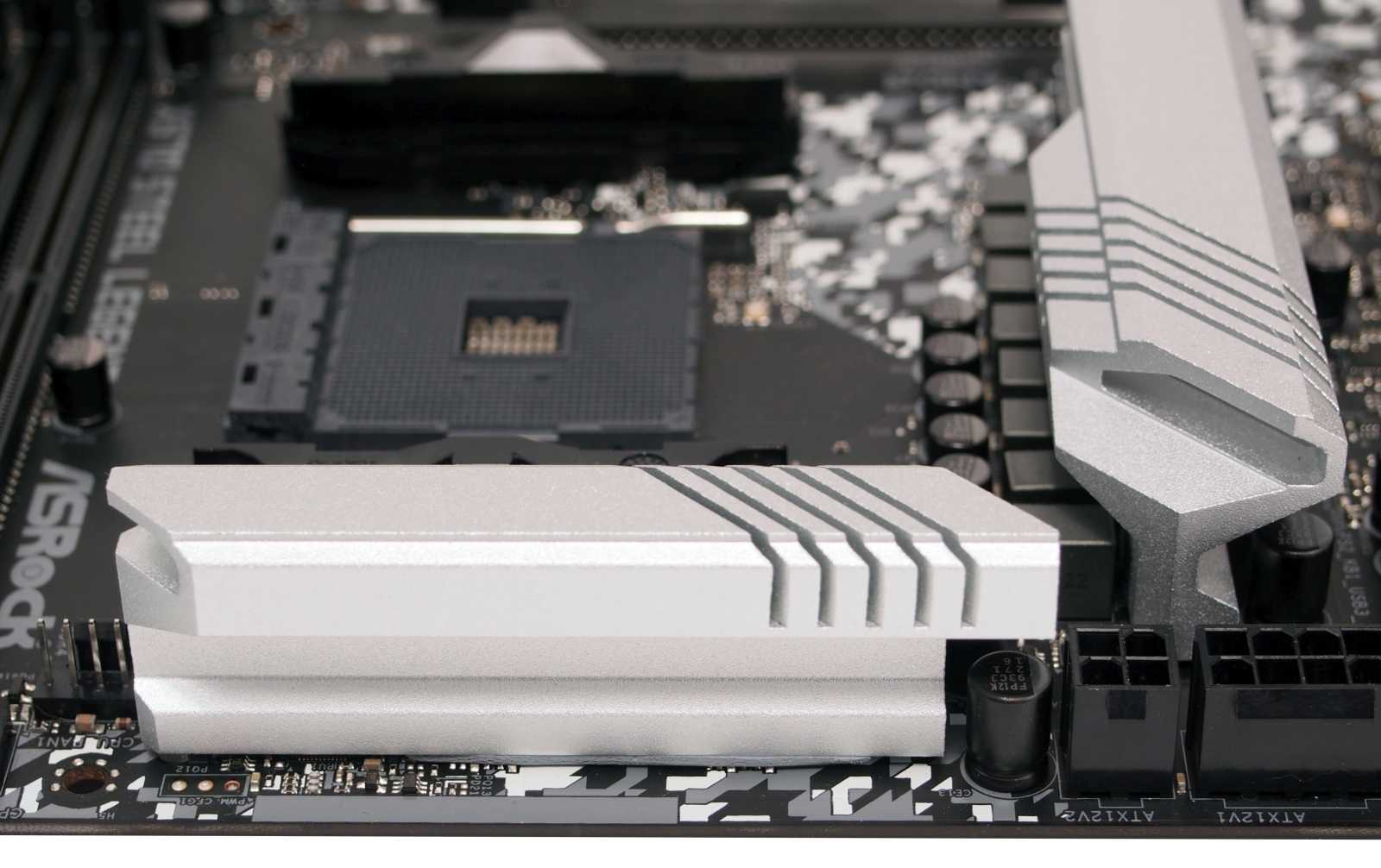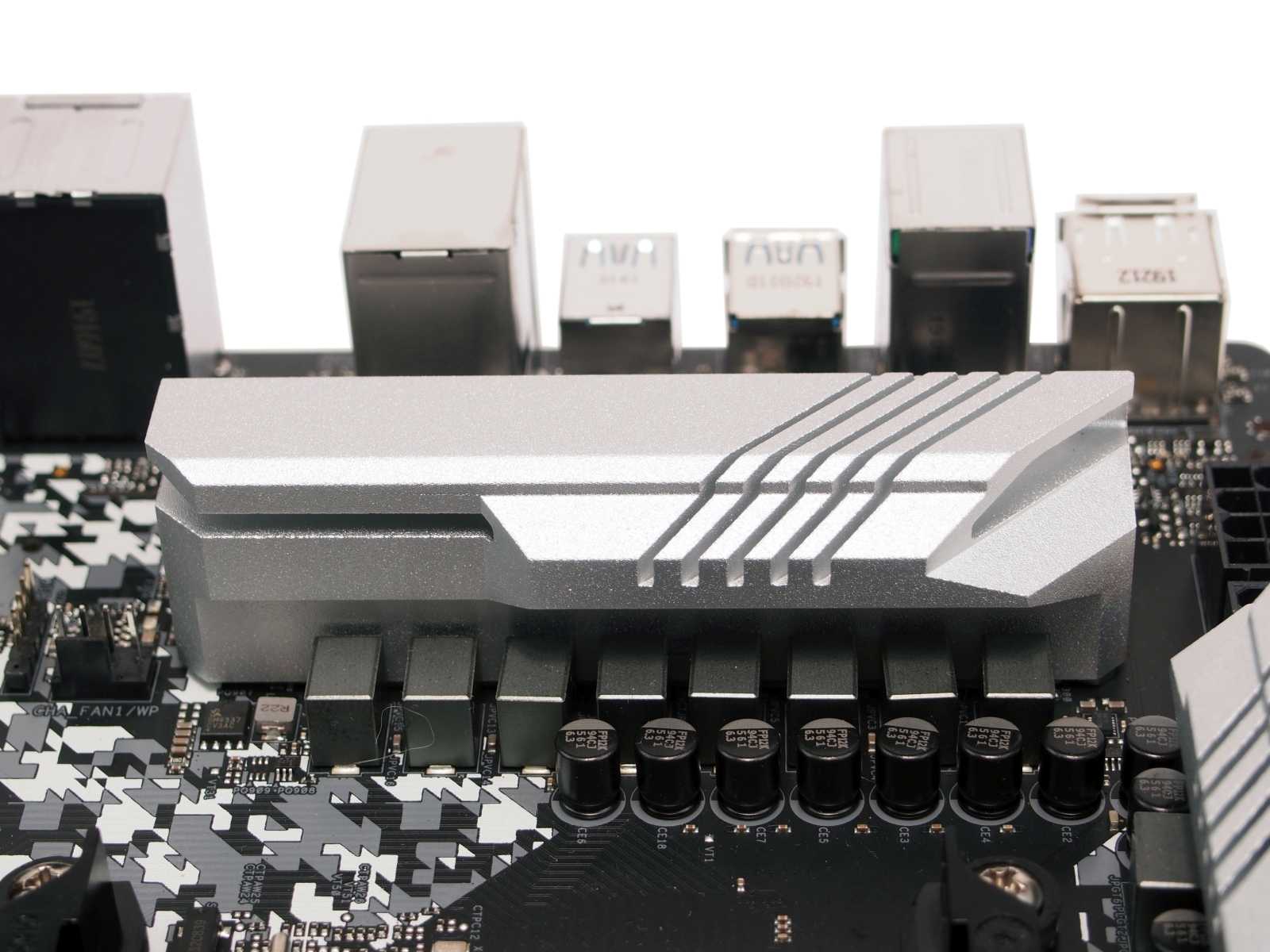 Для накопителей, устанавливаемых в разъемы М.2_1 и М.2_2, предусмотрено охлаждение с помощью массивной алюминиевой пластины. Передача тепла на радиатор от накопителей производится через термопрокладки.