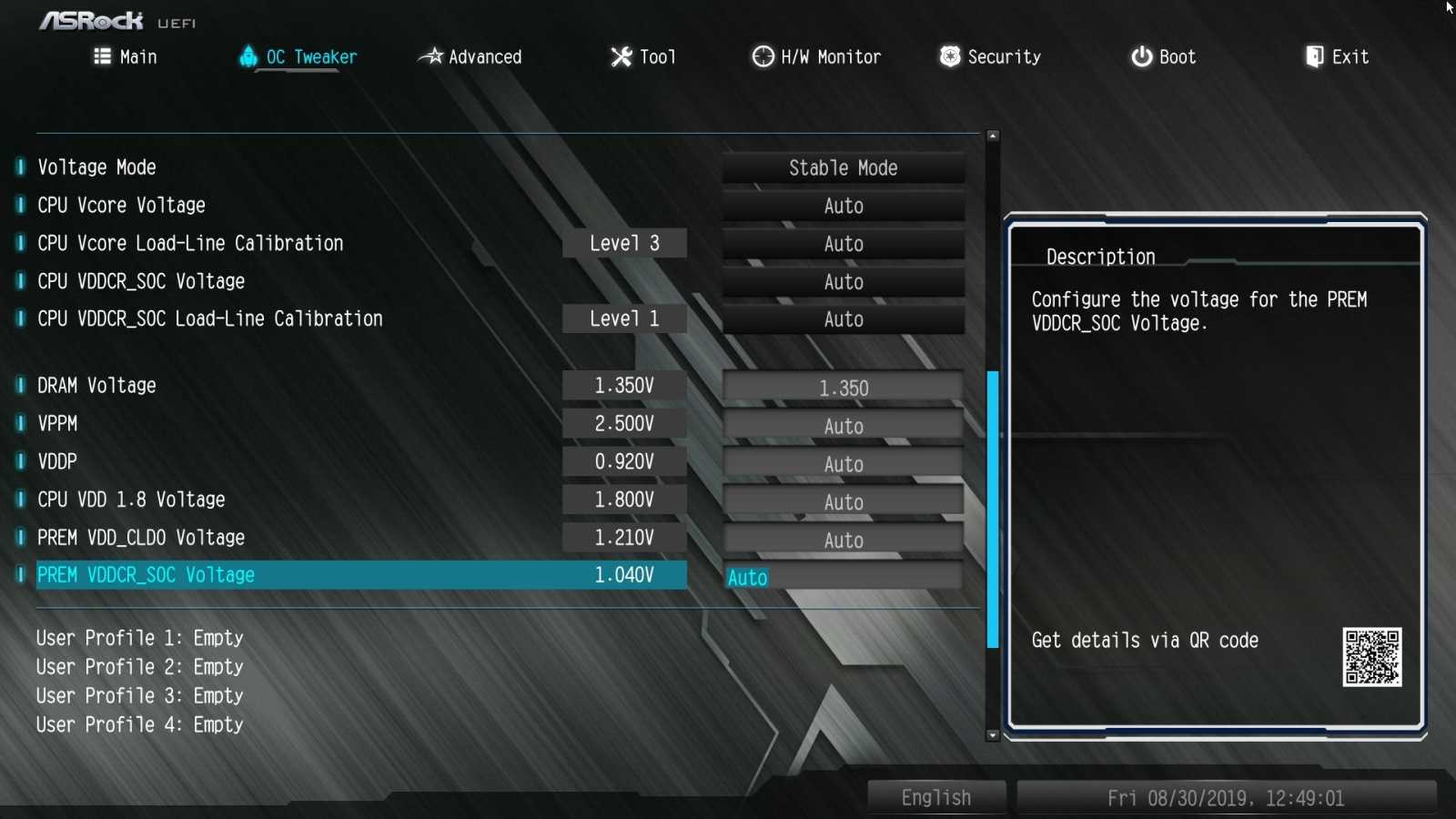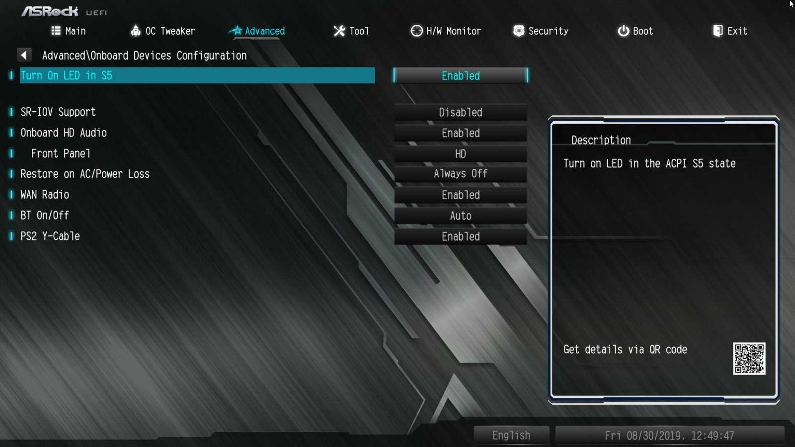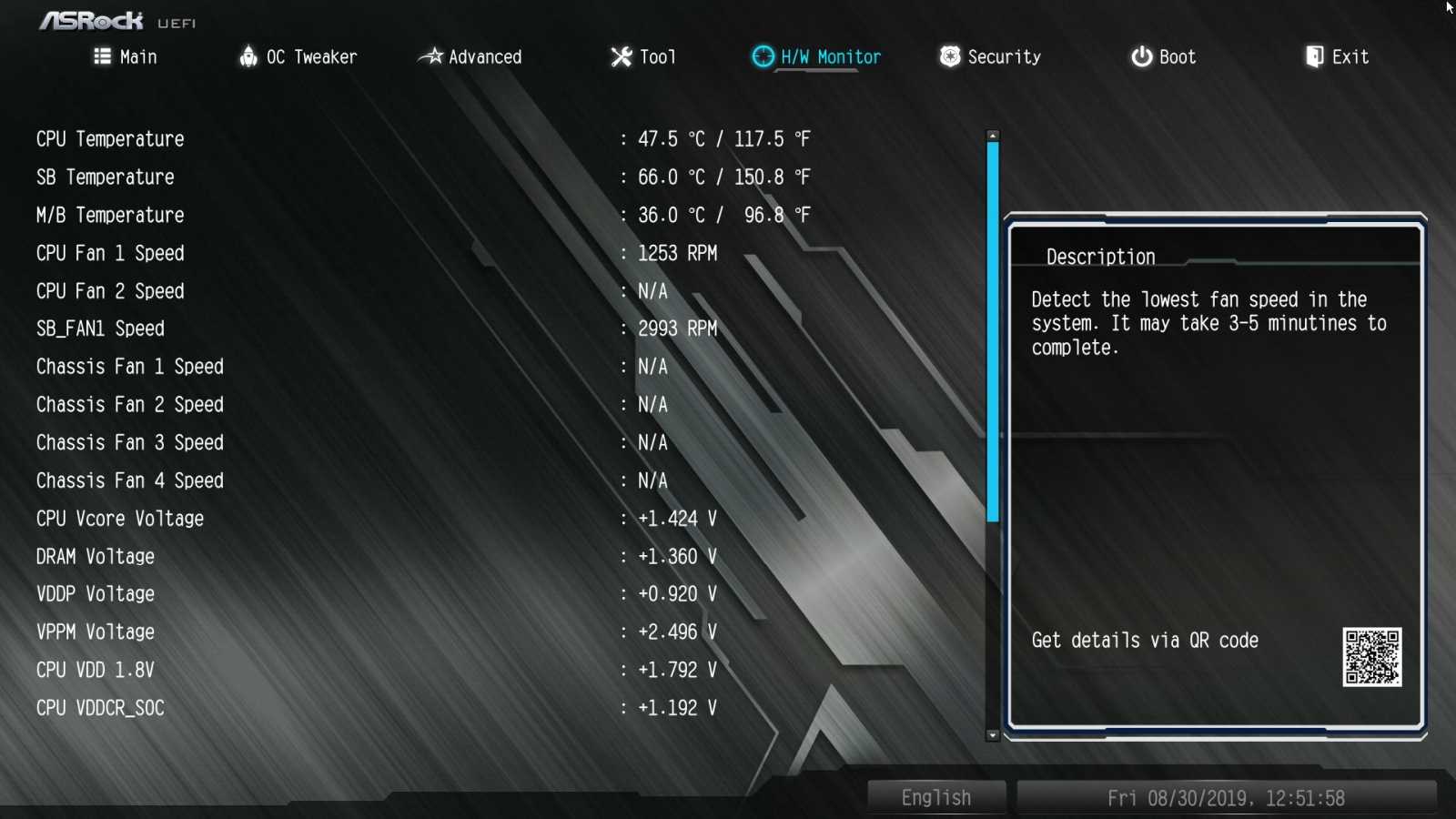 Еще одним значимым разделом настроек в интерфейсе BIOS платы X570 Steel Legend является «H/W Monitor». В нем реализован не только мониторинг текущих температур, напряжений и скоростей вращений вентиляторов, но и управление последними. Допускается тонкая настройка работы вентиляторов в зависимости от температуры компонентов системы.