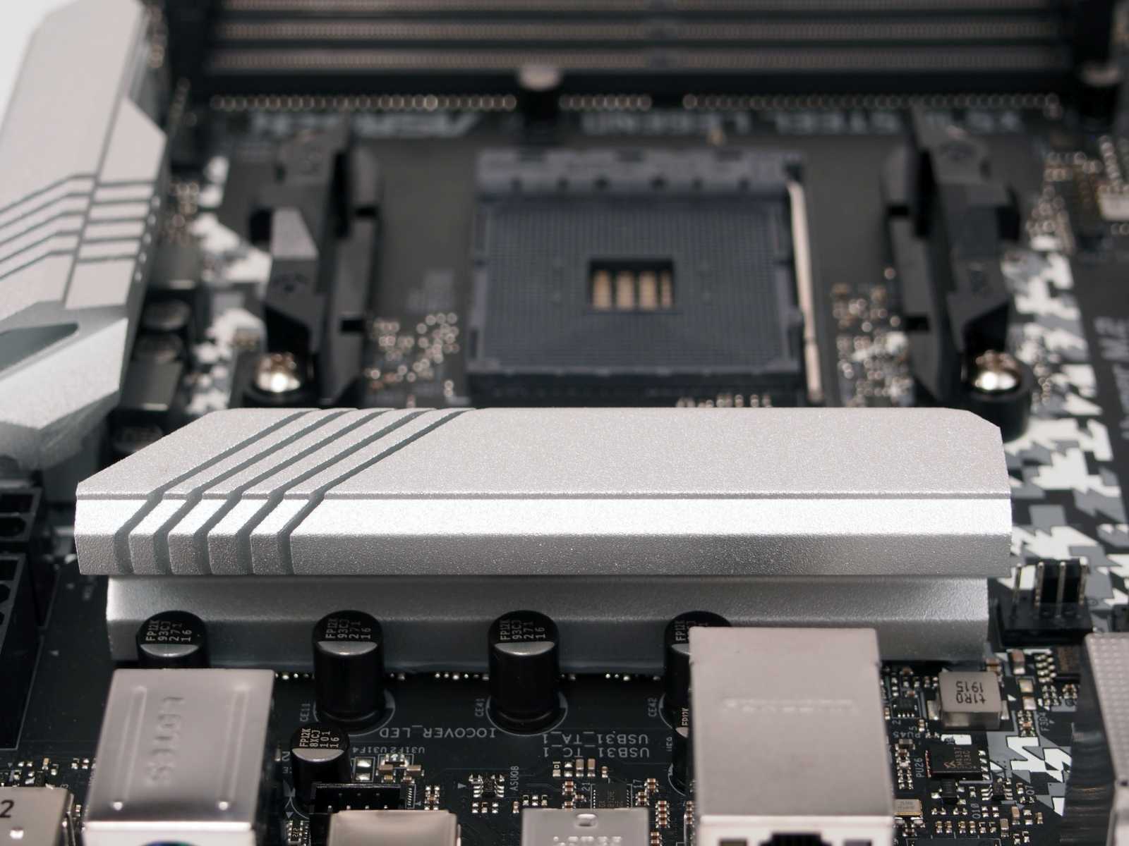 Для теста M.2 мы использовали накопитель Corsair MP600 емкостью 2 Тбайт. Длина составляет 8 см, скорость чтения Corsair указывает на уровне 4.950 Мбайт/с, скорость записи — 4.250 Мбайт/с. Модуль SSD использует протокол NVMe 1.3 и четыре линии Gen4 от чипсета или процессора.