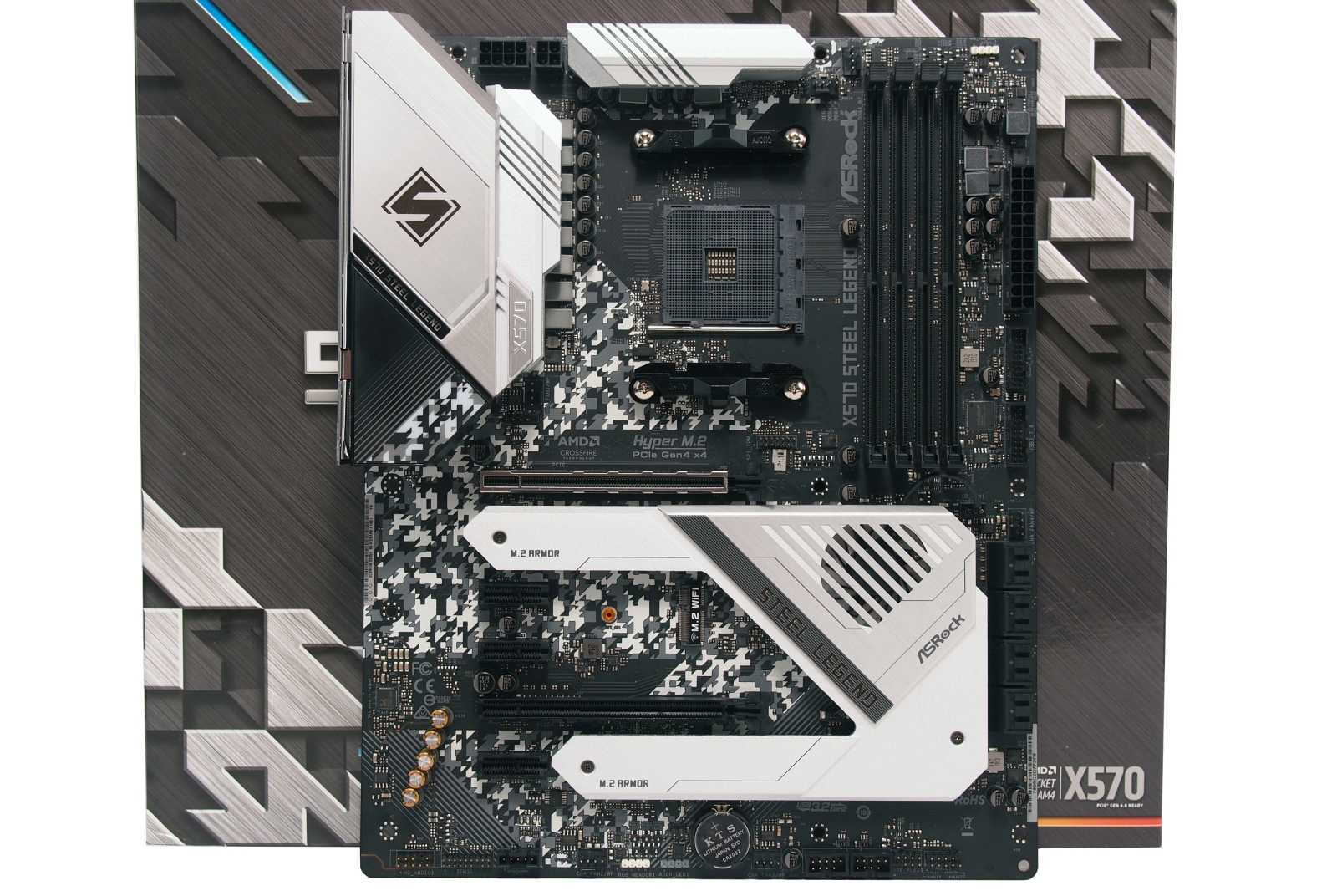 Материнская плата X570 Steel Legend относится к категории полноразмерных моделей. Выполненная в форм-факторе АТХ, она обладает габаритами 305 х 244 мм. В качестве покрытия для печатной платы производитель использовал преимущественно темно-серый цвет, применив в некоторых местах камуфляжный рисунок.