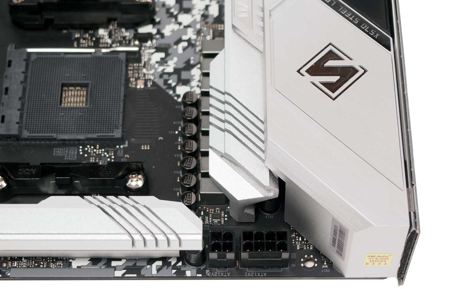 Система питания процессора на X570 Steel Legend реализована по 10-фазной схеме. С этой моделью материнской платы производитель ориентируется на геймеров, поэтому избыточно мощная VRM для экстремального разгона здесь не присутствует. Вместе с этим производитель позаботился об эффективном охлаждении цепей питания за счет двух массивных алюминиевых радиаторов.