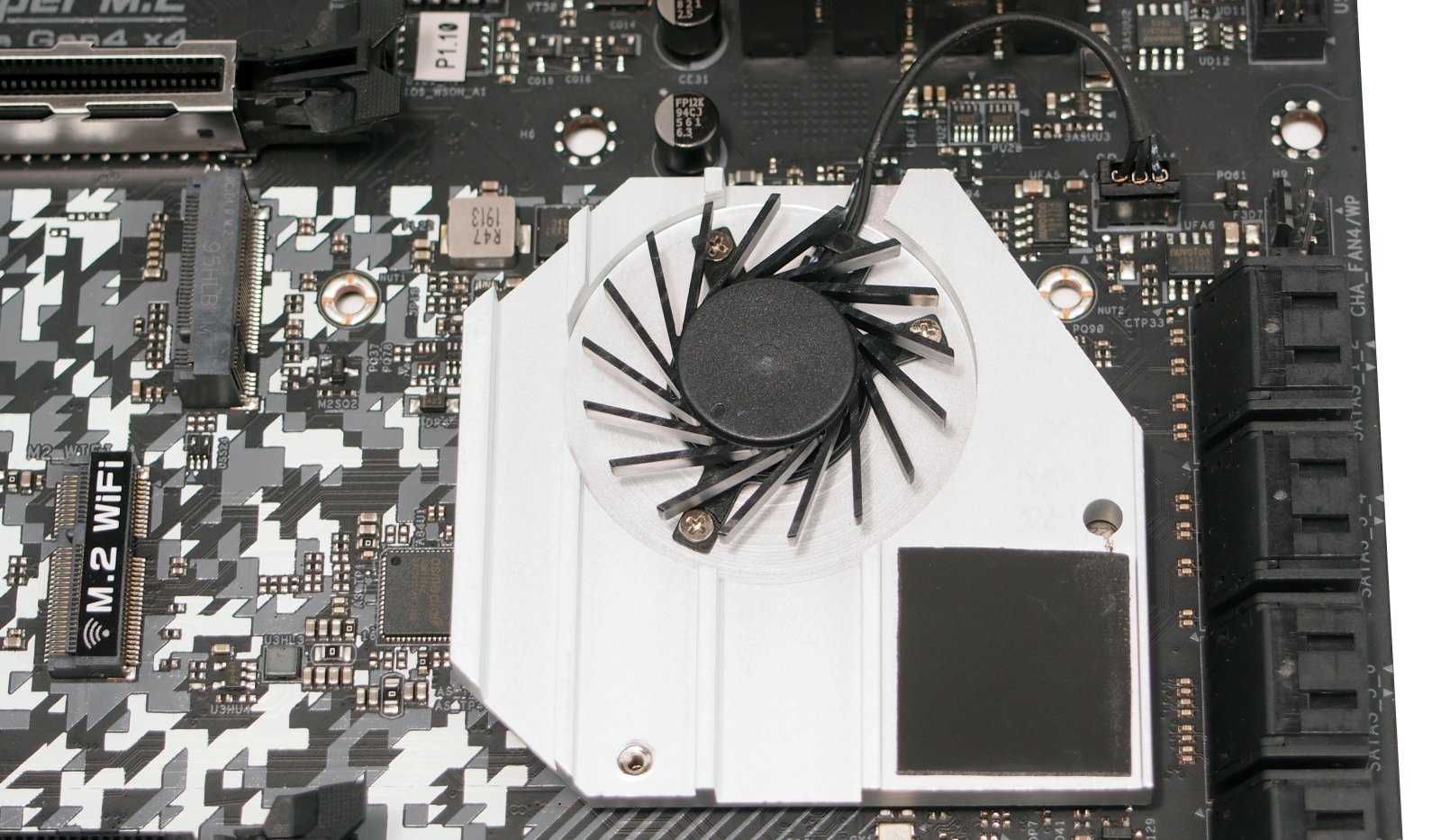Чипсет AMD X570 «прославился» своим горячим нравом, поэтому на X570 Steel Legend предусмотрено активное охлаждение в виде небольшого вентилятора сверху алюминиевого радиатора.