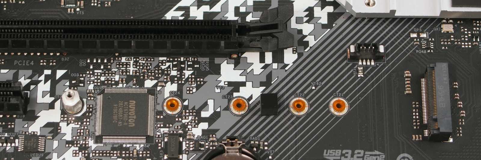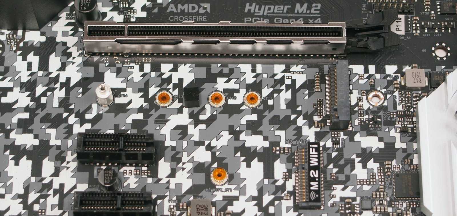 Оба слота поддерживают PCIe 4.0, и, насколько мне известно, ни один из занятых не отрубает разъёмы SATA3, которых у материнки всего восемь. Есть, кстати, и поддержка Crossfire, а верхний слот PCIe – армированный.