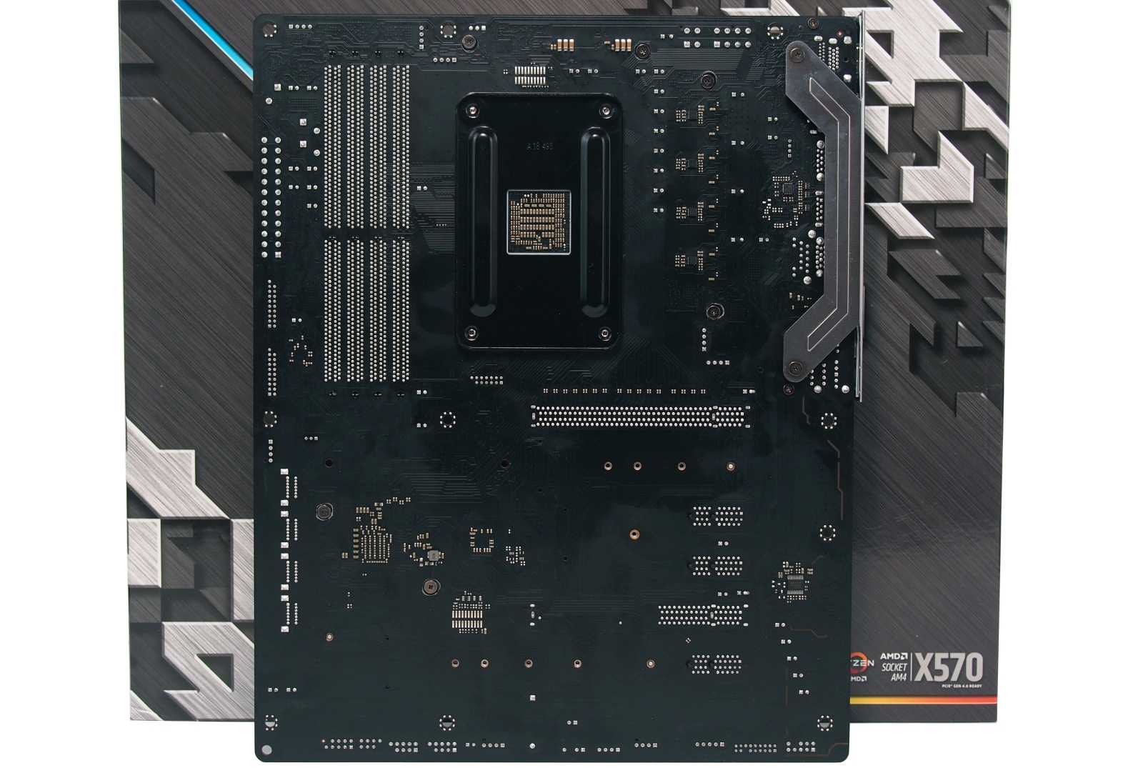 Тыльная сторона печатной платы X570 Steel Legend полностью открыта. Исключениесоставляет лишь металлическая пластина для крепления заглушки разъемов тыльной панели.