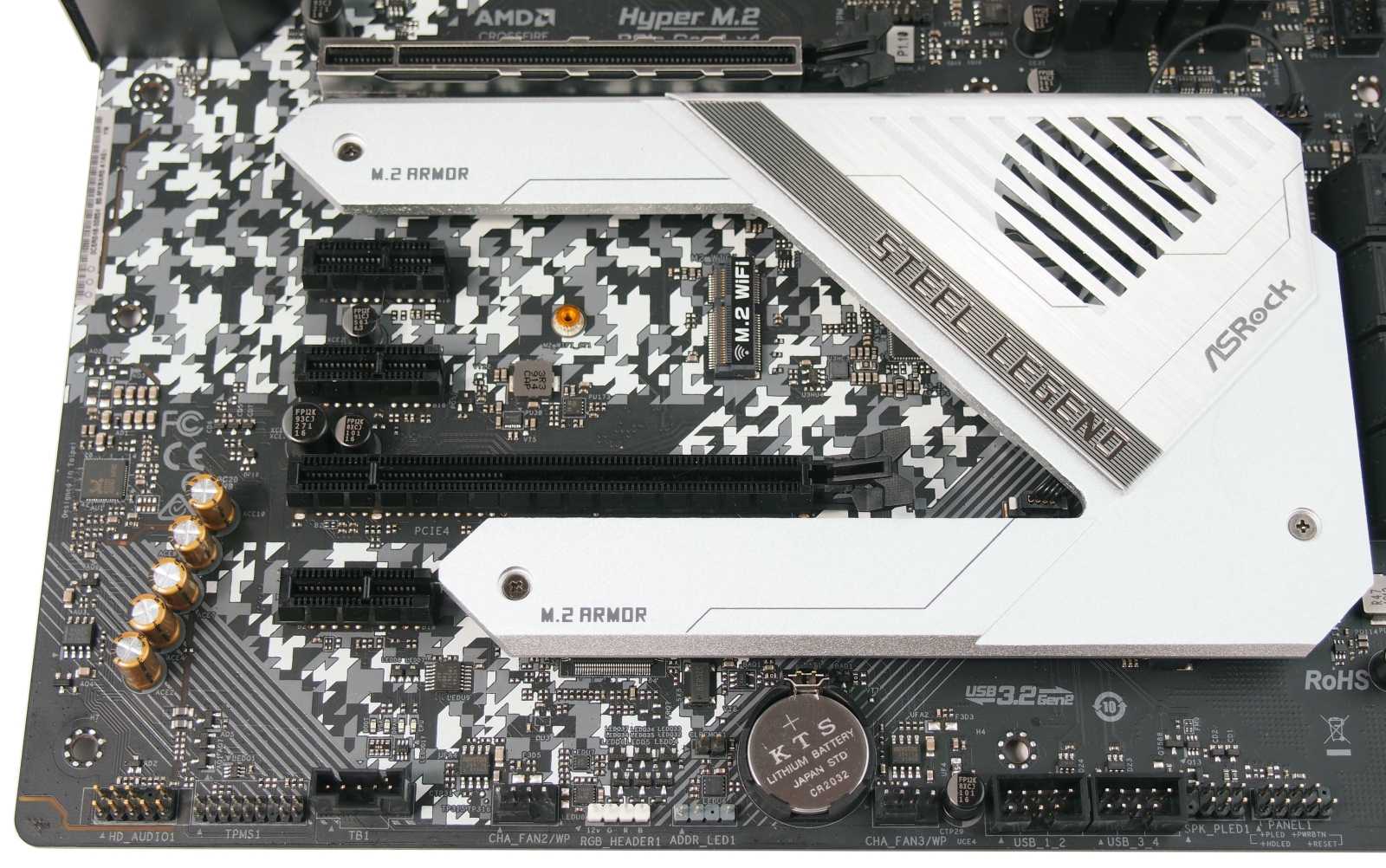 Околосокетное пространство X570 Steel Legend плотно занято подсистемой питания процессора и радиаторами охлаждения. На декоративной панели указано наименование чипсета и модель материнской платы. Внутри корпуса этой панели реализована RGB-подсветка.