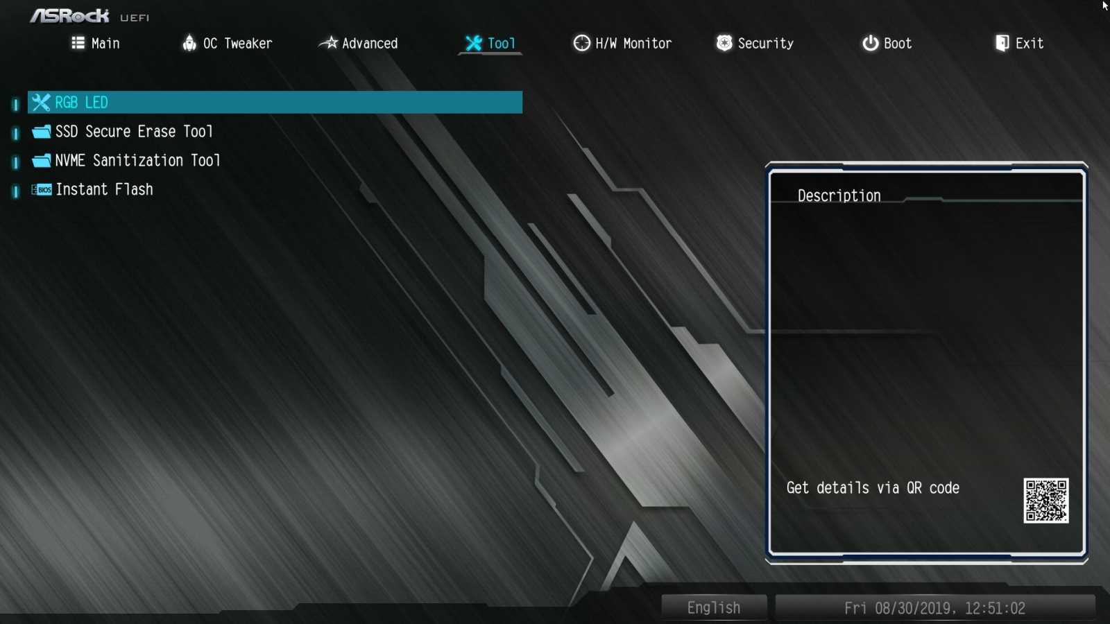 Раздел «Tool» вобрал в себя сервисные настройки материнской платы, включающие работу RGB-подсветки, операции с накопителями и обновление прошивки BIOS.