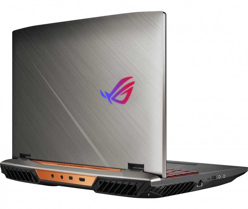 В целом, никто не ожидает, что ноутбук весом почти 5 кило будет выглядеть воздушным и невесомым – но его внешний вид должен быть стильным и не производить впечатление десктопа, втиснутого в ноутбучный форм-фактор. И в этом плане у ASUS ROG G703 все в порядке – он не выглядит чрезмерно громоздким, просто очень крупный ноутбук формата desktop replacement; окрашенная «под бронзу» металлическая поверхность крышки смотрится достаточно строго, светящийся логотип ROG однозначно указывает на принадлежность к игровой линейке, а благодаря черной окраске базы и скошенным внутрь граням субъективно ноутбук воспринимается более тонким, чем есть на самом деле.