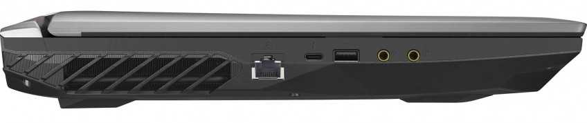 На правой боковой грани расположены SD-кардридер и два порта USB 3.1, на левой – еще один USB 3.1, Thunderbolt 3, порт Ethernet и два мини-джека – один для гарнитуры, один для микрофона. Сзади находится впечатляющих размеров разъем питания, два видеовыхода (HDMI и Mini DisplayPort 1.4) плюс четвертый USB 3.1.