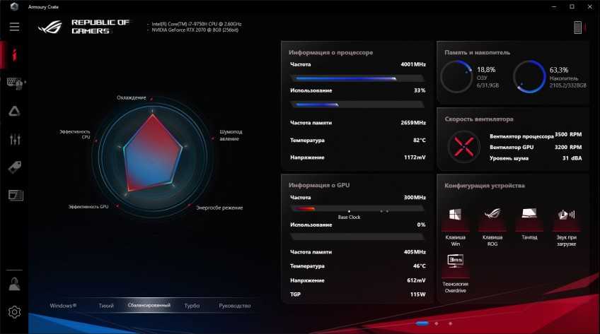 Фирменный софт Armory Crate работает как командный центр. Из него можно управлять производительностью, мониторить температуры и обороты вентиляторов, задавать цветовые схемы и яркость подсветки, переназначать клавиши,  подгружать дополнительные программы, конфигурировать реакцию системы на ключ Keystone.