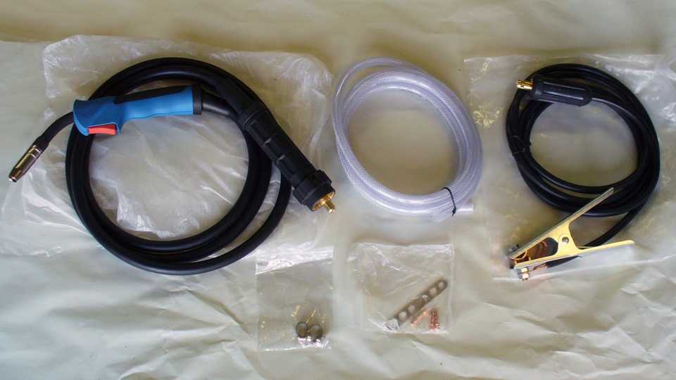 горелка MIG-MAG (съемный еврорукав) 3 метра — 1 шт.кабель 25мм 3 метра — 1 шт.зажим на массу 300А — 1 шт.шланг для подачи газа 3м — 1шт.Хомуты -2шт.Ключ — 1шт.Медные наконечники 0.8мм -2шт, 1мм — 2шт.