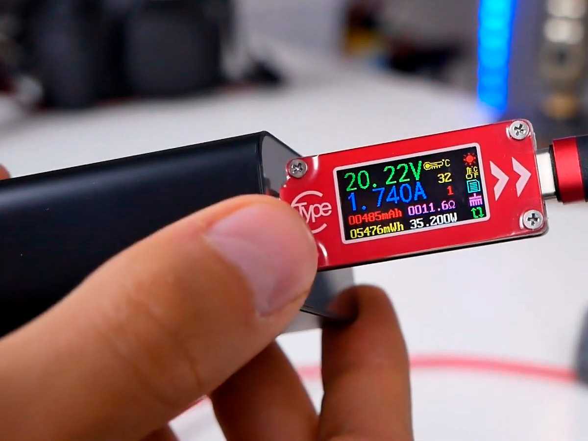 При напряжении 20.2 В, к сожалению все уперлось в ток 1.74 А, так как тестер не позволил поднять его выше и данный тест нельзя назвать полноценным (заявлено 20В/2.25 А).
