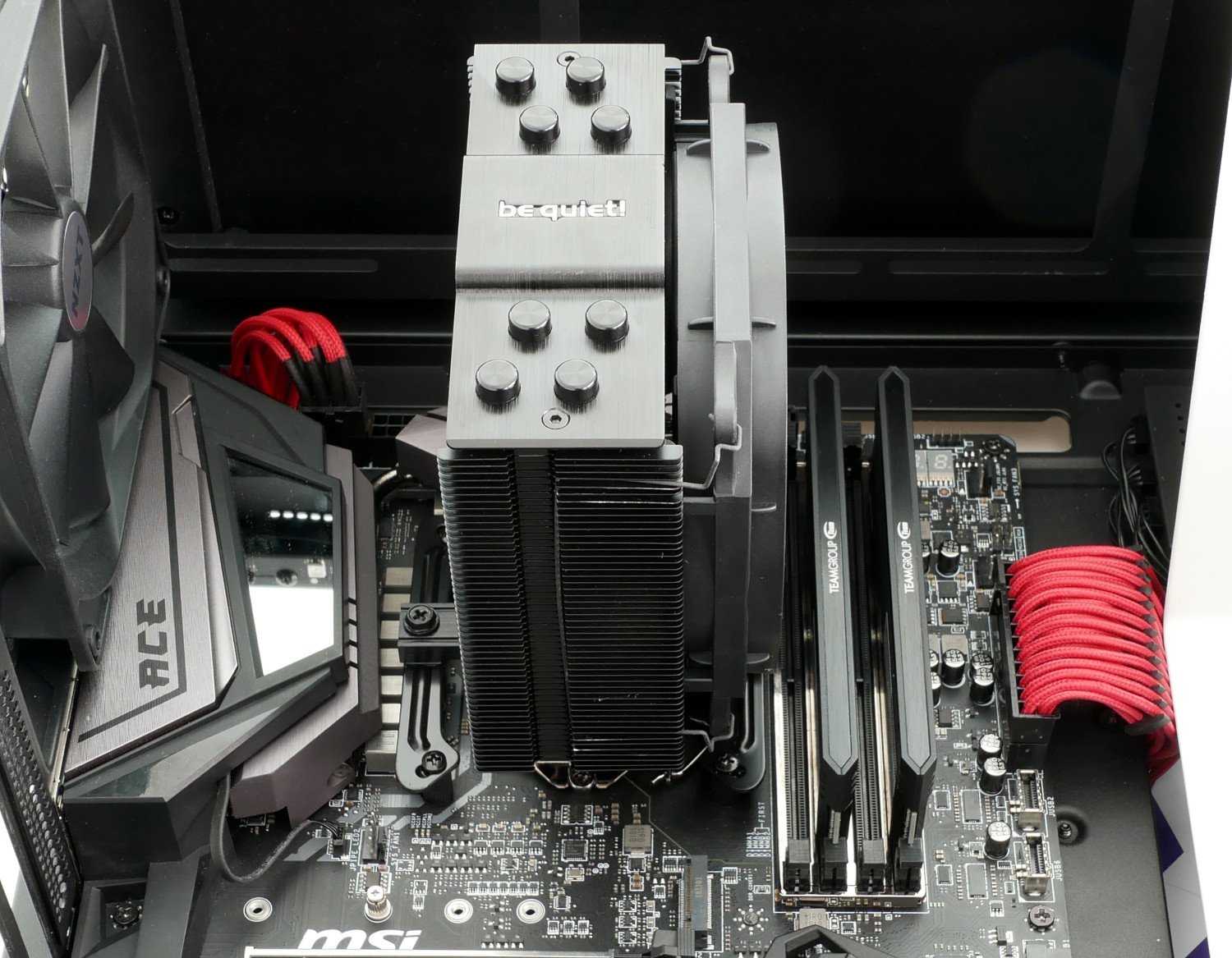 Процесс монтажа у be quiet! Dark Rock 4 Pro не самый простой и не самый сложный. Мы смогли его установить на материнскую плату, не вынимая её из корпуса, но у суперкулеров встречали и чуть более простой процесс. Мы устанавливали его, как на AMD, так и на Intel. Впрочем, в минусы это записать нельзя в данном случае, потому что здесь небольшая дополнительно требуемая от рук ловкость обусловлена внешним видом. Был бы он попроще визуально, процесс бы тоже оказался проще. Но дизайн, повторимся, здесь на очень высоком уровне. Даже несмотря на то, что у самого кулера нет подсветок, такой хочется осветить простой белой светодиодной лентой. Есть что созерцать.
