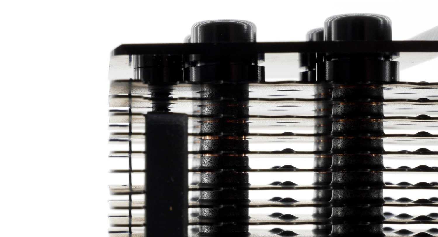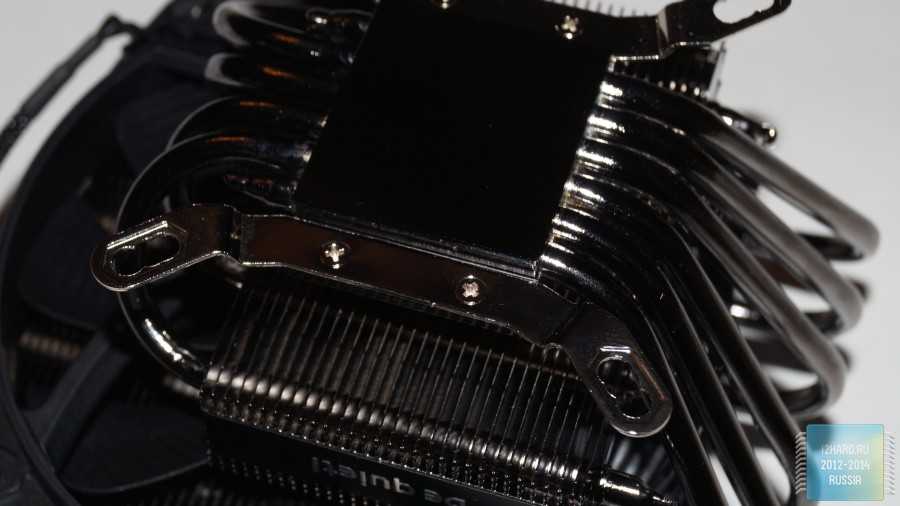 Всего в конструкции использовано шесть медных никелированных тепловых трубок. К пластинам они присоединены с помощью опрессовки, а в основании пропаяны и лежат в желобках на расстоянии не более 1,5 мм друг от друга.