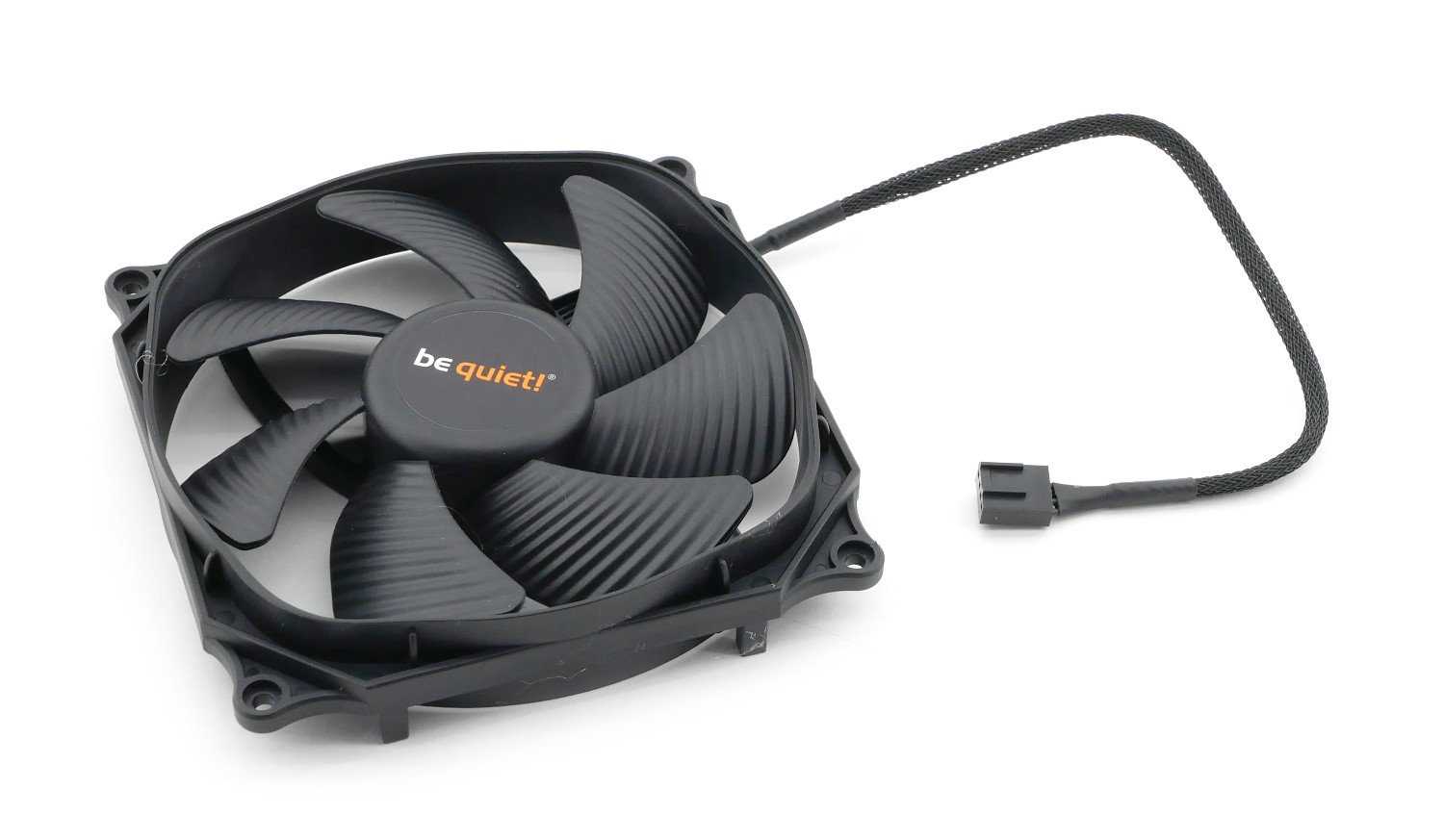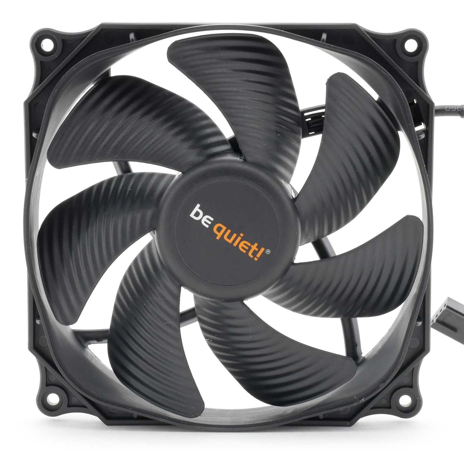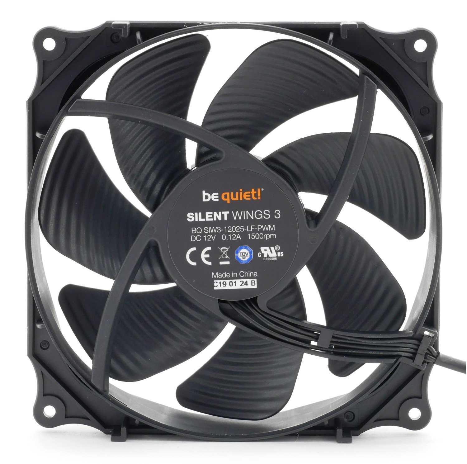 Вентилятор be quiet! Silent Wings 3 PWM 120 mm выполнен в общих тонах со строгим черным отливом, получившим крыльчатку с характерным рисунком, что является одной из фирменных технологий по улучшению и повышению эффективности. В качестве подшипника применяется гидродинамический. Заявленная скорость вращения составляет 1500 об/мин, но благодаря ШИМ-регулировке удалось достичь широкого диапазона от 380 об/мин до 1540 об/мин.Создаваемый воздушный поток равен 80,4 м3/ч (50,5 CFM), статическое давление — 1,79 мм водяного столба, а уровень шума не превышает 23,6 дБА. Некоторые параметры не блещут производительностью, но стоит учесть, что данная модель рассчитана, в первую очередь, на тихую работу.