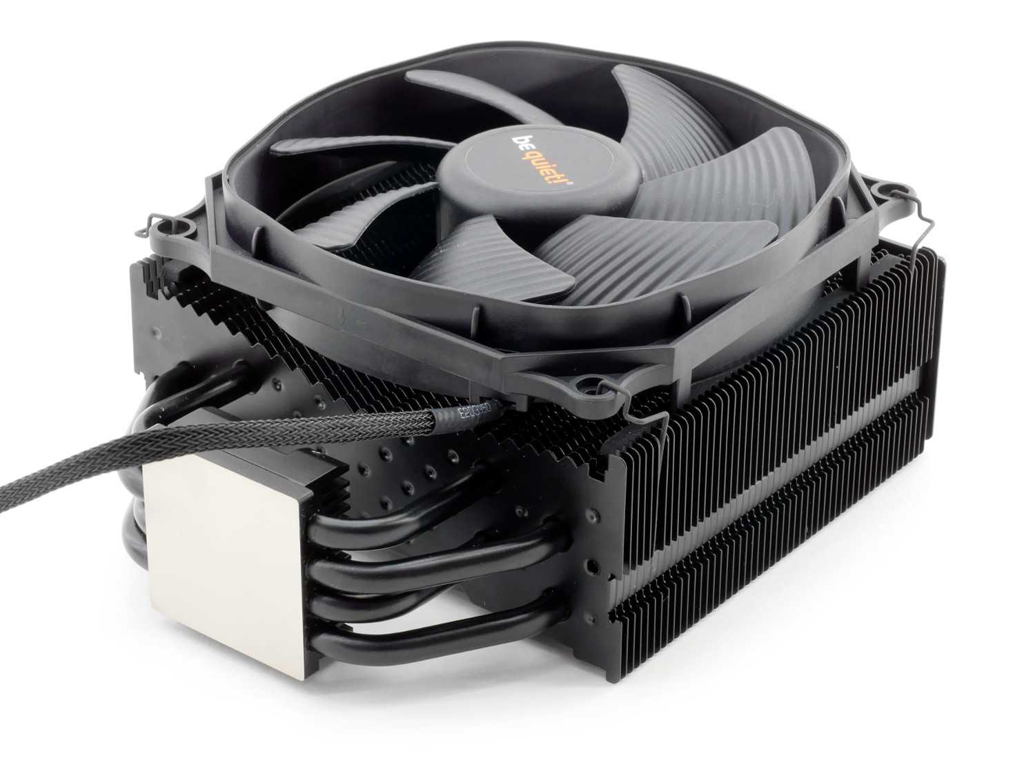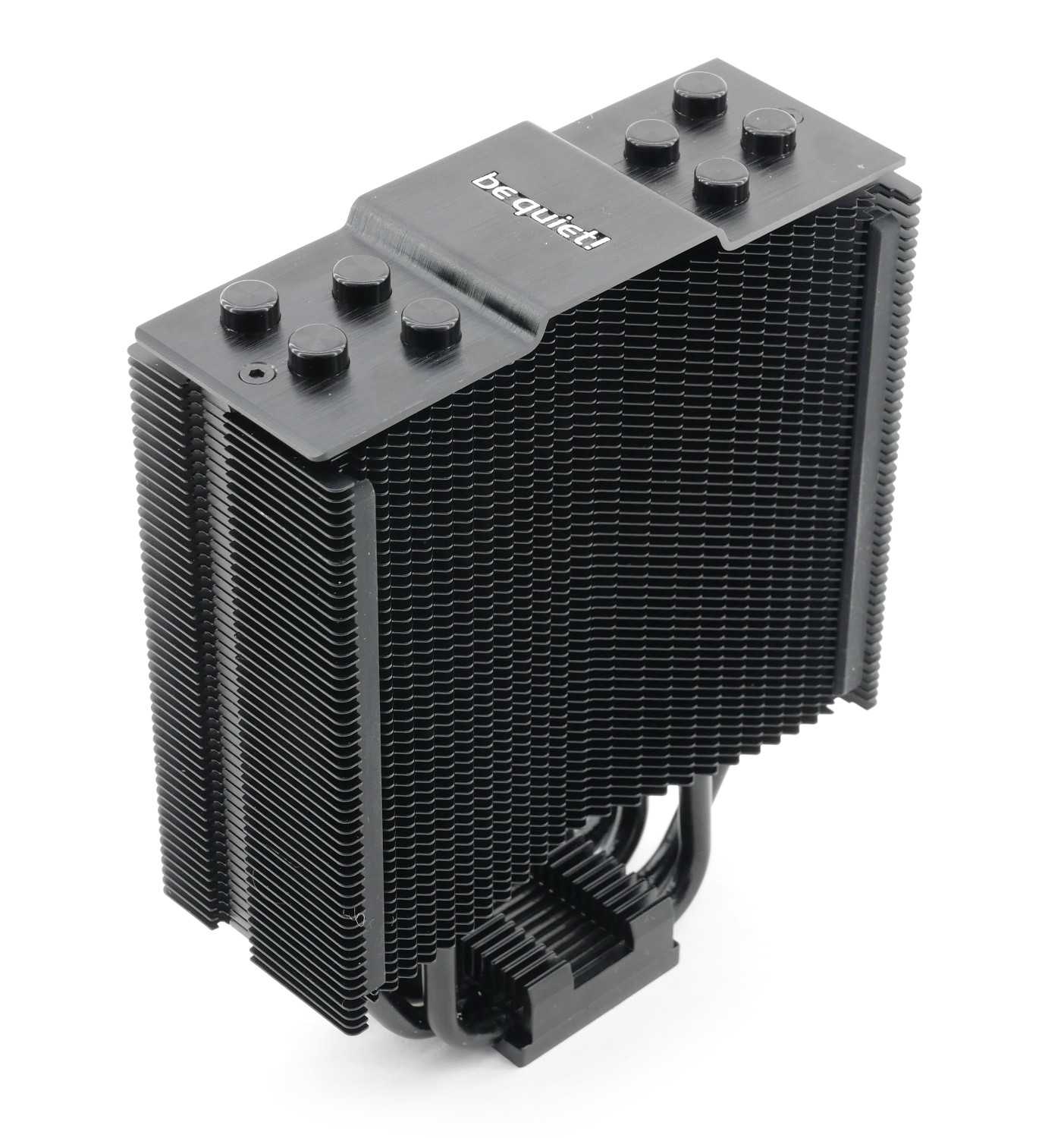 Очевидно, что таким образом be quiet! пытается решить проблему малой площади радиаторов у кулеров топ-конструкций. Большой радиатор, почти равномерно пронизанный шестью тепловыми трубками, состоит из 62 алюминиевых пластин размерами 140 × 35 мм, а малый, в который входит только четыре тепловых трубки, — из 31 пластины размерами 64 × 27 мм. Таким образом, суммарная расчётная площадь радиаторов кулера составляет 7220 см2, что для такой конструкции весьма неплохо.