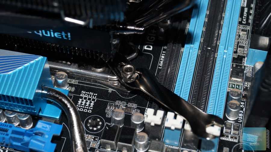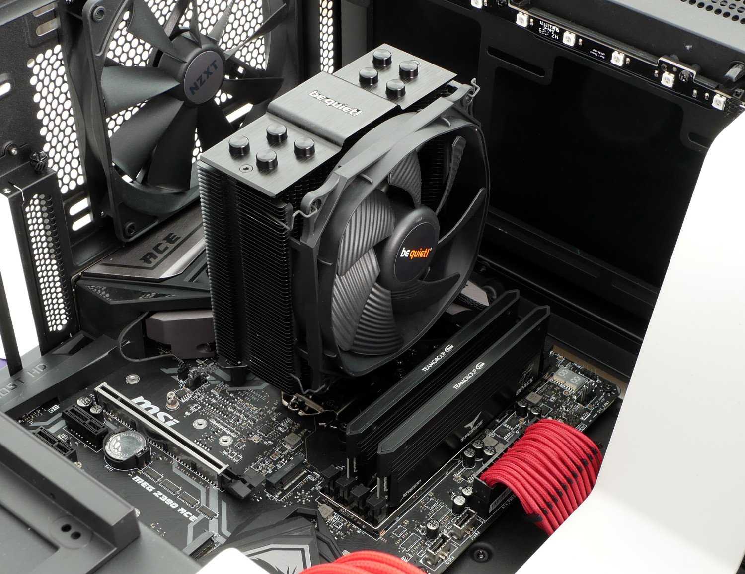 Устанавливается Dark Rock TF привычно для be quiet!, то есть – основа с крепежами позади материнской платы, сверху в четыре точки устанавливается кулер, и закручивается снизу. С высокопрофильной ОЗУ у данной модели проблемы только в случае, если вы устанавливаете оба вентилятора, или один, но снизу, между основной и дополнительной радиаторными секциями.