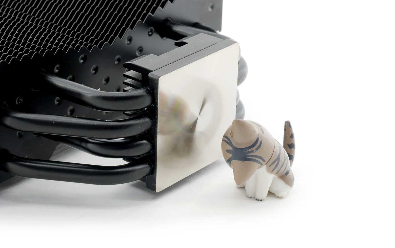 Минимальная толщина медной никелированной пластины под трубками составляет 2,5 мм, а размеры самой пластины равны 43 × 43 мм. Качество обработки контактной поверхности последней находится на довольно высоком уровне, хотя зеркальной полировки здесь нет.