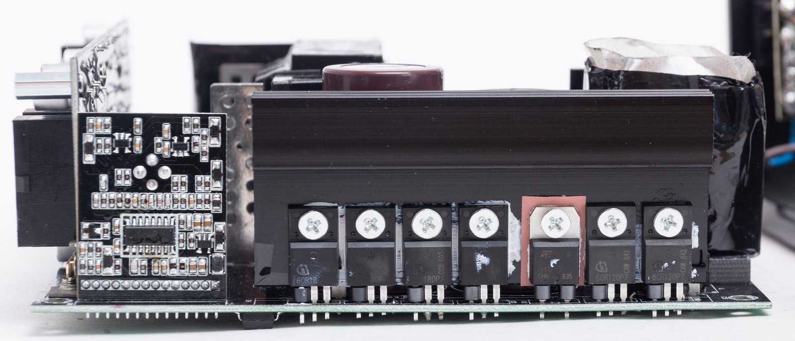 Далее идет дроссель APFC силовых элементов корректора – диод и два мосфета Infineon IPA60R120P7. Контроллер корректора находится на вертикальной плате, закрытой изоляцией.