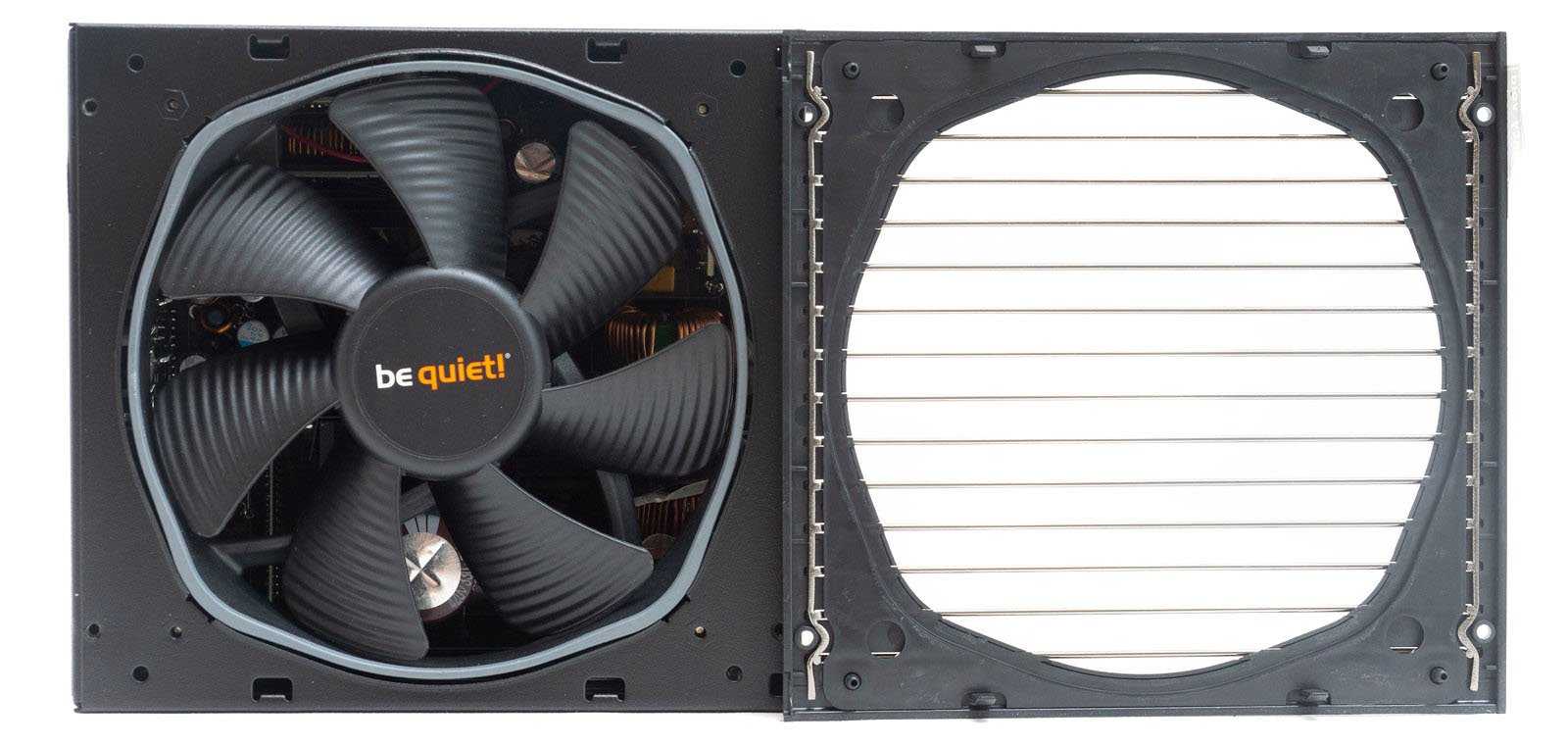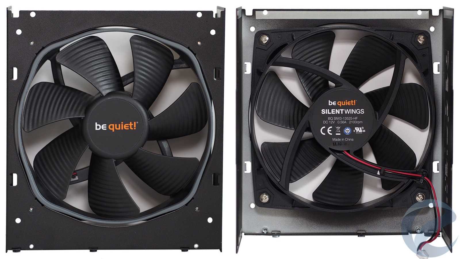 Точная модель BQ SIW3-13525-HF, параметры питания — 12 В, 0,56 А, максимальная скорость вращения 2100 оборотов в минуту. Конструкция пластикового каркаса вентилятора оптимизирована под конкретную модель блока питания, верхний край цилиндрического воздухозаборника по краю оснащен резиновым кольцом для минимизации дребезга об пластиковую панель с решеткой-«гриль».
