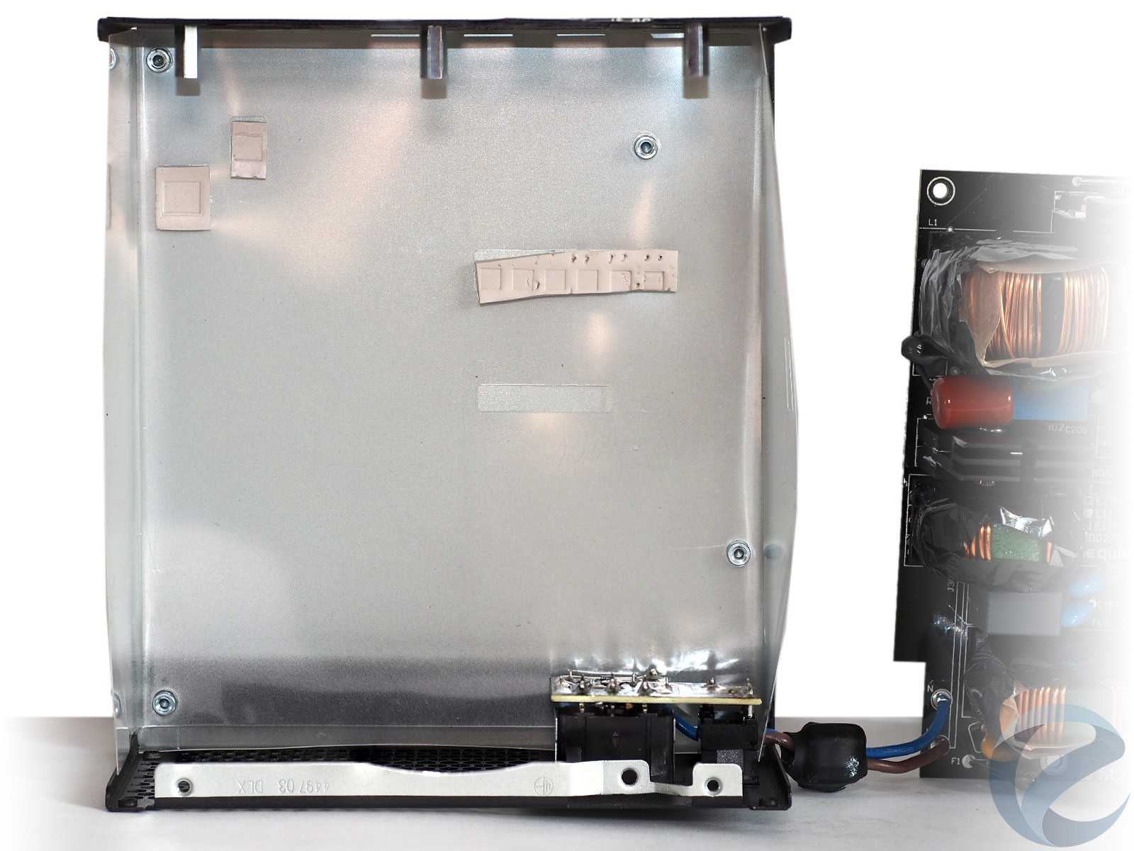 С лицевой стороны — мелкая перфорация на две трети всей панели. На не перфорированной части расположен тумблер включения и сетевая розетка, над ними — наклейка с логотипом компании и обозначением входящих напряжений.
