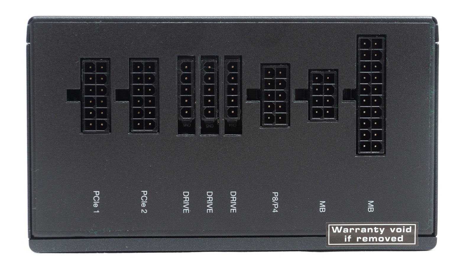 На тыльной панели вертикально в один ряд разместились разъемы для подключения модульных кабелей. Все разъемы подписаны на картонной наклейке. Здесь же мы видим гарантийную наклейку.