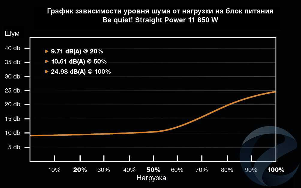 Имевшийся на момент тестирования шумомер Актаком ATE-9015 имеет нижний порог измерений 30 дБа, а вентилятор Silent Wings 3 работает тише, поэтому ограничимся таблицей уровня шума при разной нагрузке на блок питания от производителя. В большинстве системных блоков выделить звук работы блока питания Be Quiet! Straight Power 11 850W будет непросто, он работает крайне тихо.