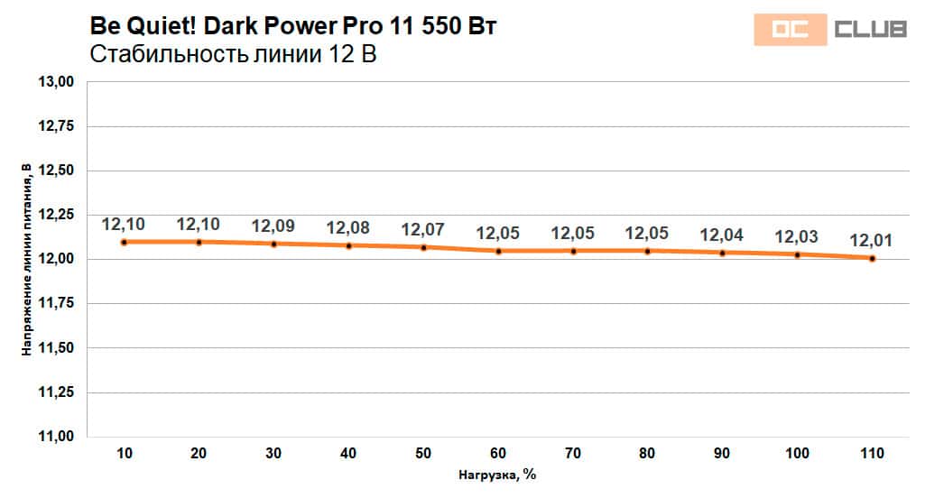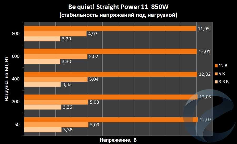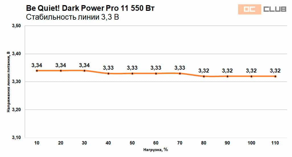 При включении блока питания без нагрузки напряжение основных линий питания 3.3 В, 5 В и 12 В — чуть завышенное (в пределах допустимого), что абсолютно нормально и сделано специально, чтобы компенсировать закономерное падение значений во время работы под нагрузкой. В ходе тестов были получены следующие результаты стабильности напряжения под нагрузкой.