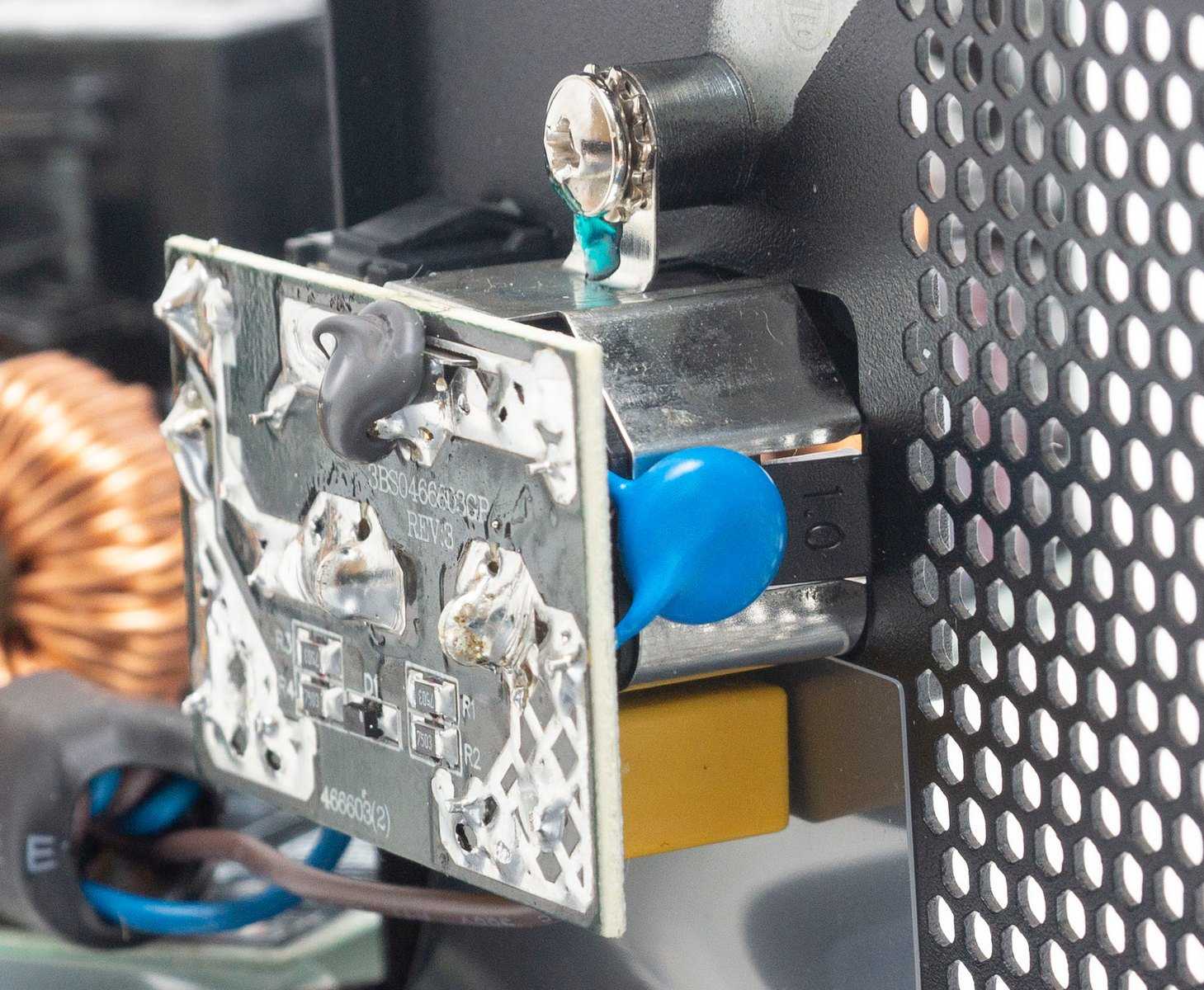 На входе мы видим фильтр электромагнитных помех на основе нескольких звеньев. На входной розетке плата с X конденсатором и двумя Y конденсаторами, имеются резисторы, разряжающие конденсаторы.