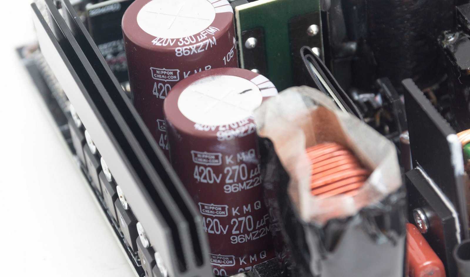 Два сглаживающих конденсатора японского производства Nippon Chemi-Con емкостью по 330 и 270 мкФ, рассчитанные на напряжение до 420 В и температуру до 105 °C.