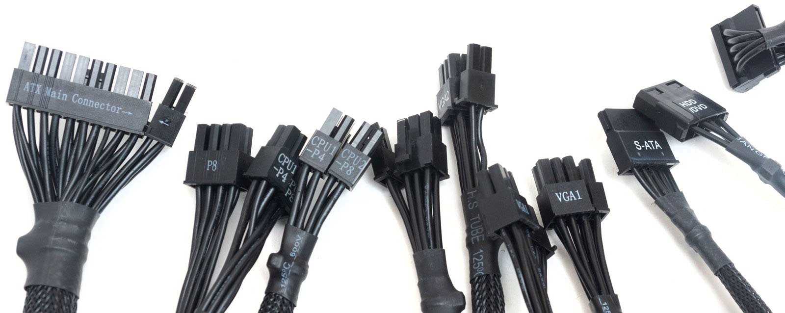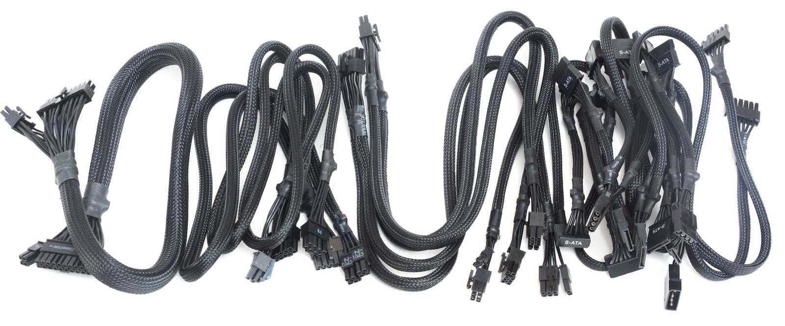 Набор кабелей впечатляет. Все они набраны черными проводами калибра 16AWG и 18AWG, заключенными в нейлоновую оплетку. Края оплетки зафиксированы на стяжки и термоусадку.