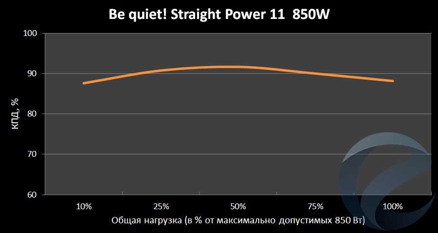 Блок питания Be quiet! Straight Power 11 850W отмечен значком стандарта энергоэффективности 80 Plus GOLD. Соответствующий отчет о прохождении сертификации представлен в базе данных на официальном сайте Plug Load Solutions. Средний КПД блока питания Be quiet! Straight Power 11 850W находится на уровне 90,19% и достигает значения 91,66% при нагрузке 50%, что с запасом укладывается в «золотой» стандарт.