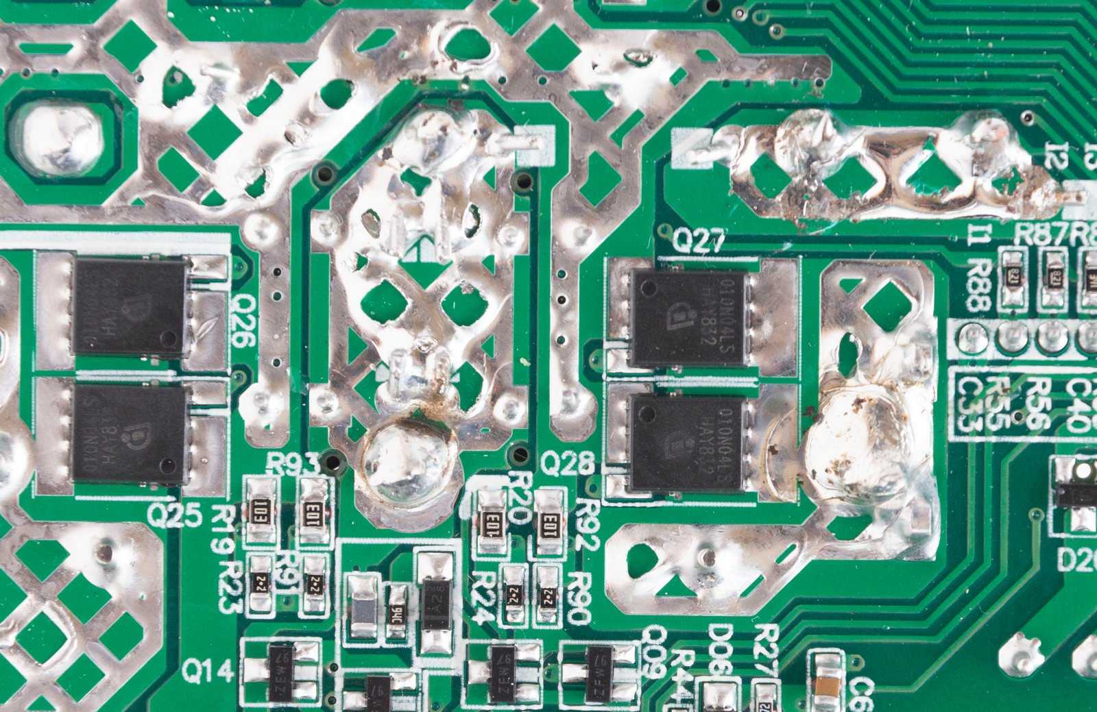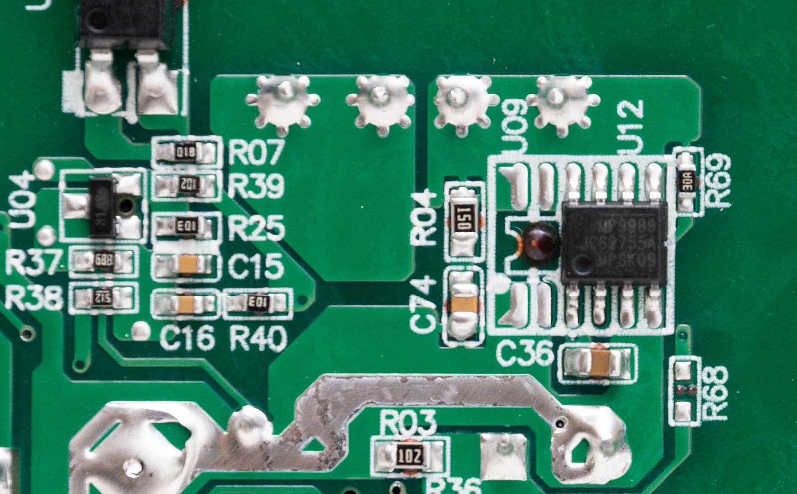 Пайка на тыльной стороне платы выполнена аккуратно, дорожки усилены припоем, нанесенным в виде сетки. Местами видны следы несмытого флюса.
