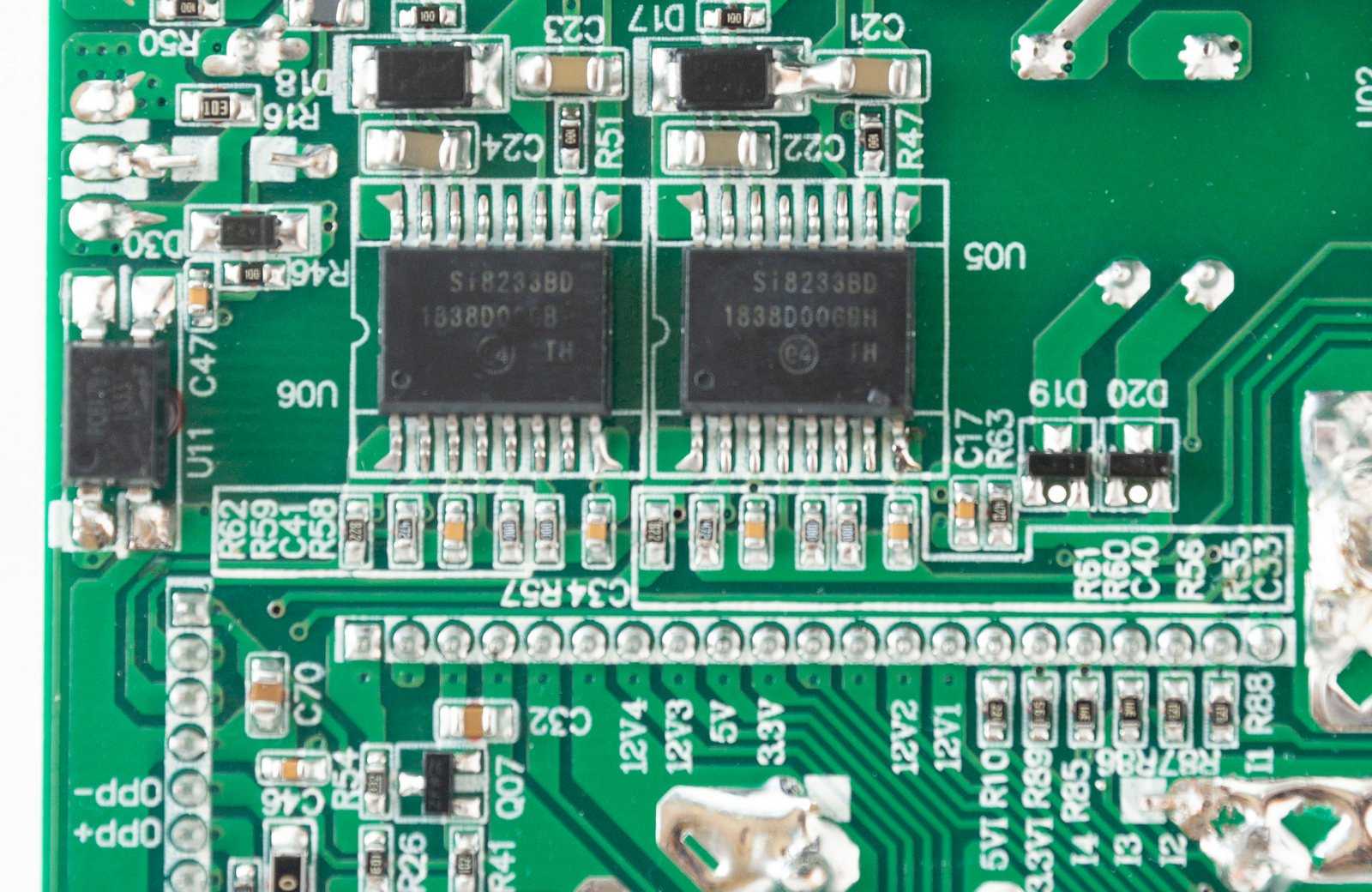 На общем радиаторе находятся четыре ключа главного преобразователя Infineon IPA60R180P7. Два контроллера преобразователя Si8233BD расположены с обратной стороны платы.