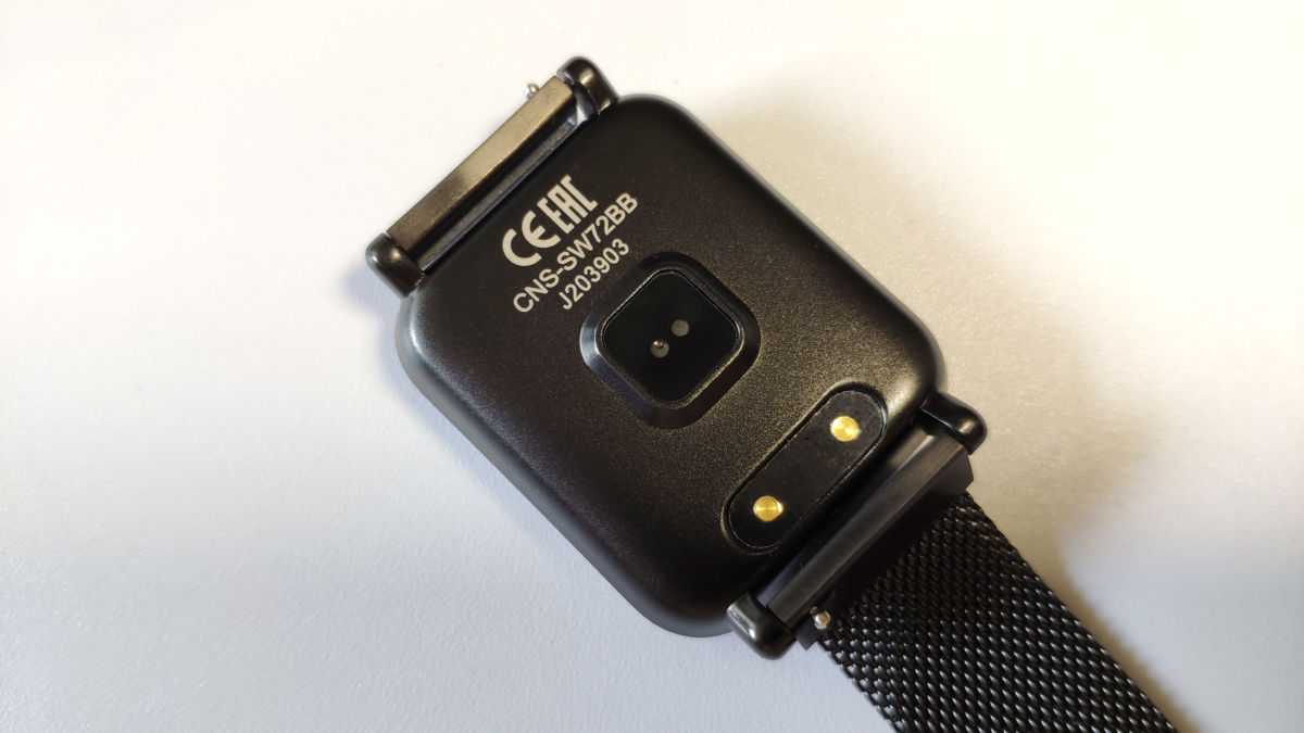 На обратной стороне часов разместился лазерный датчик пульса и анализа работы кровеносных сосудов, а также контакты для подзарядки гаджета. Для этих целей в комплекте имеется специальная клипса с захватом для точного позиционирования часов по контактной паре.