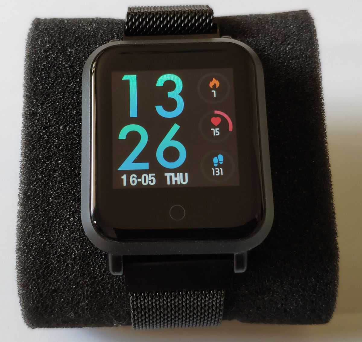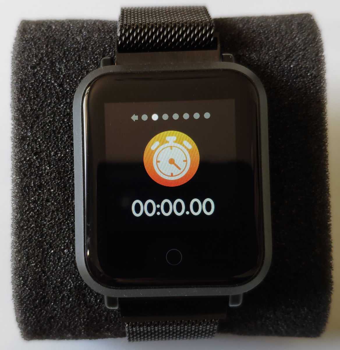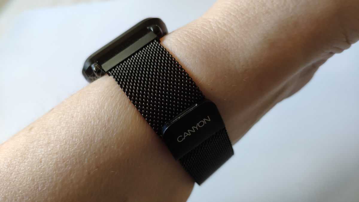 Наручные часы — это, прежде всего, элегантный внешний вид, который должен радовать не только владельца, но и вызывать интерес у собеседника. Это, без сомнения, относится к смарт-часам Canyon CNS-SW72BB. Обычный черный прямоугольник без единой кнопки управления на гранях — производитель называет это «геометрический дизайн». Смотрится необычно, особенно с черным металлическим браслетом на магнитной пряжке и яркими большими цифрами на большом экране.