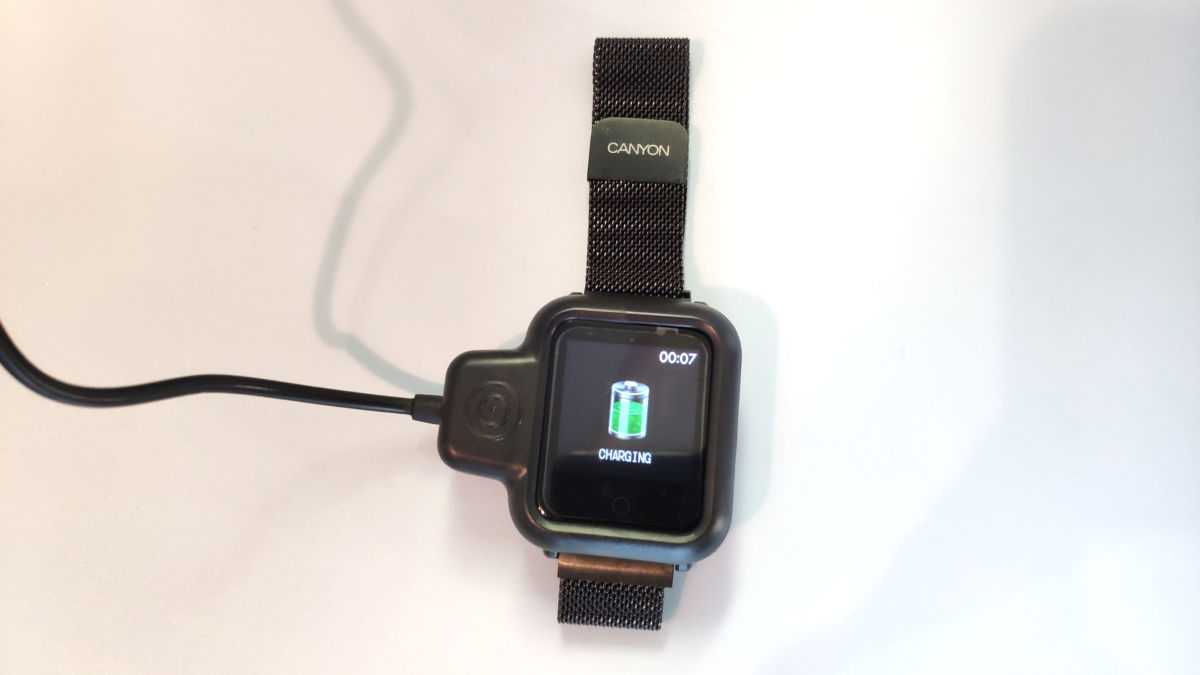 — Зарядка у Canyon CNS-SW72BB выполнена прищепкой (в инструкции так и написано «прищепка»), на практике, помещаем «капсуль» часов в зарядное устройство, там совпадают пазы и начинается процесс. С другой стороны, стандартный USB порт. Единственный вопрос к качеству пластика внешне это выглядит не очень, но в процессе длительной эксплуатации может работать успешно. Заряда хватает на несколько суток и здесь нет ничего удивительного, все носимые устройства в таком ценовом диапазоне не отличаются высокой вместительностью АКБ. Производитель заверяет что при активном использовании время на одном заряде будет около семи суток;