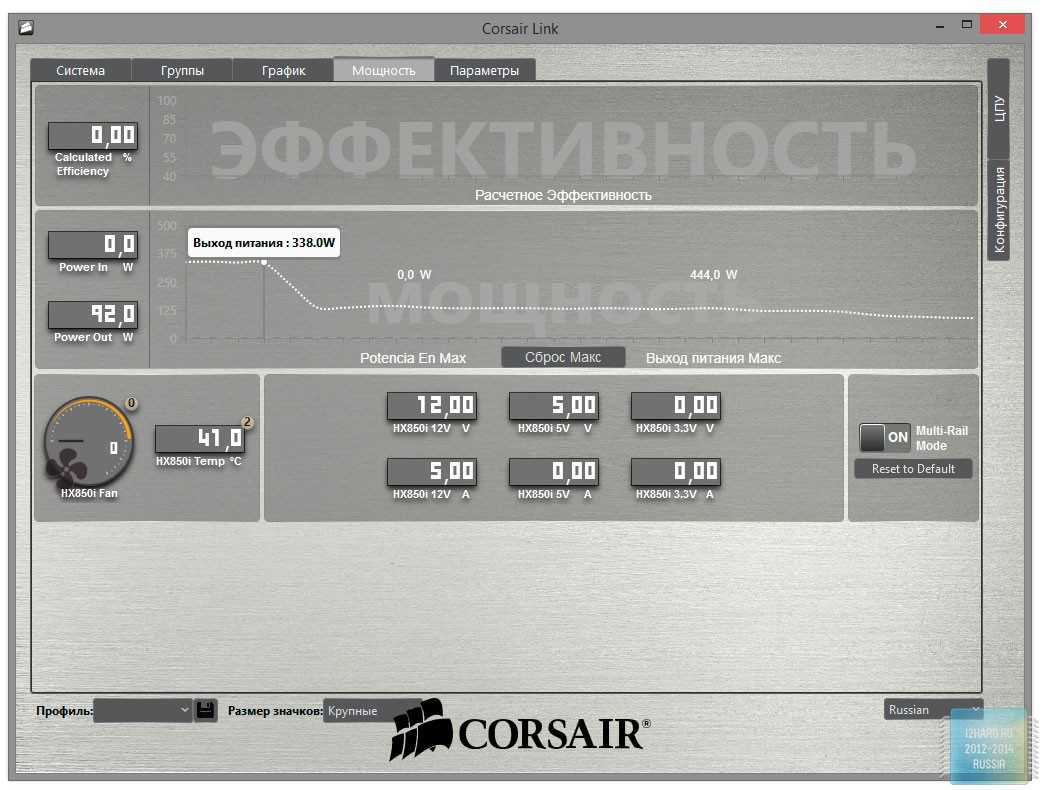 Самая интересная и, возможно, самая полезная вкладка — «Мощность». На ней можно отслеживатьэнергопотребления в реальном времени, отслеживать колебания напряжения, но показатели по линиям 12v, 5v и 3.3v подозрительно неактивны. Точнее, они не показывают отклонений. Также присутствует такой график, как эффективность, но он, к сожалению, неактивен.