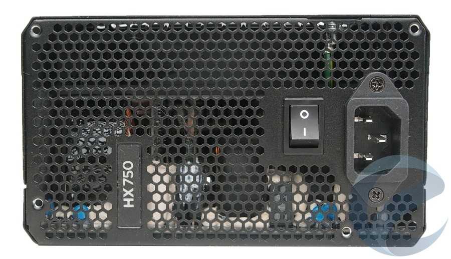 Тыльная сторона Corsair HX750 практически по всей свободной площади имеет вентиляционные отверстия в виде сот. На этой панели также присутствует маркировочная наклейка, предоставляющая информацию о модели блока питания. Для подключения кабеля используется стандартный разъем питания. Также на тыльной стороне Corsair HX750 реализован отдельный тумблер включения.
