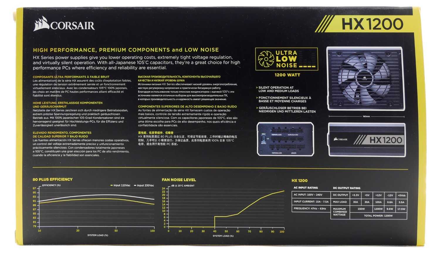 Более подробная техническая информация, включающая нагрузочную таблицу, приведена на тыльной стороне упаковки. Отметим использование японских конденсаторов, технологию Zero PWM и график эффективности блока питания.