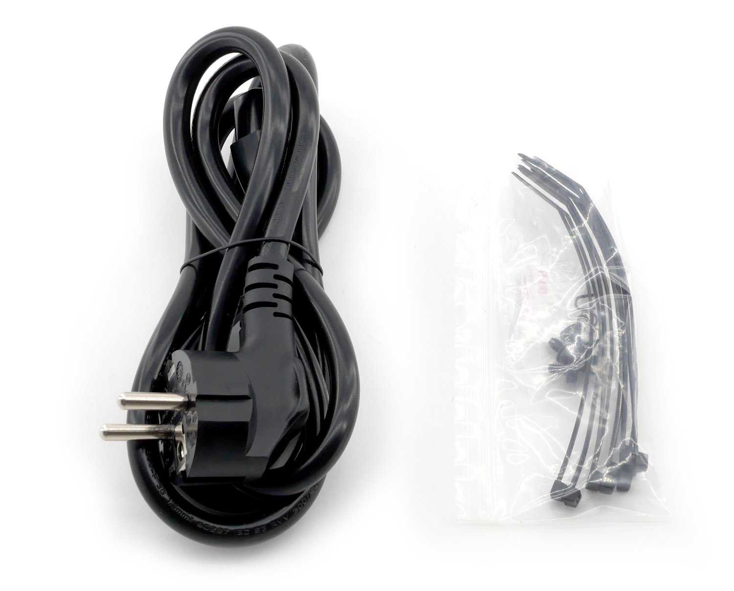 Полный перечень Corsair HX1200 сложно уместить на одной фотографии, поэтому детально разберем каждый элемент. Непосредственно в комплектацию помимо блока питания входит один кабель с EU-вилкой и набор креплений: винты и пластиковые стяжки.